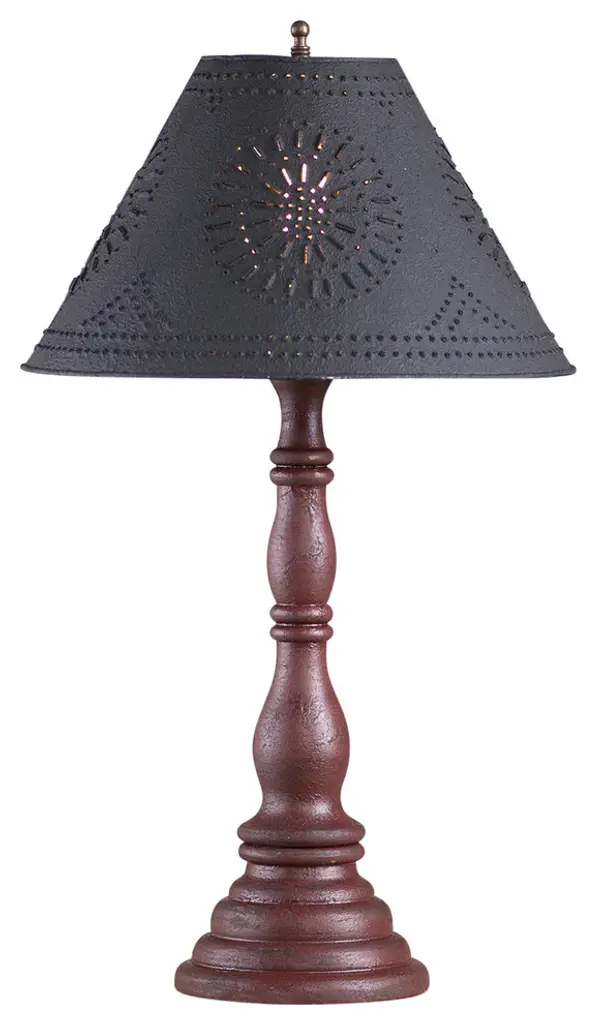 One standard socket, 100 watts max. Distressed textured paint on the base and textured black paint on the shade.Bulbs Not Included