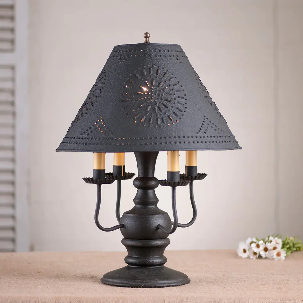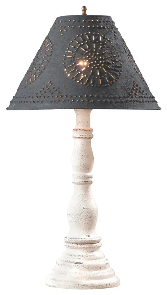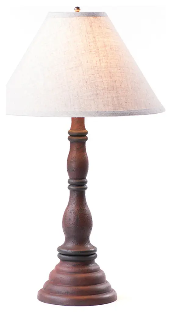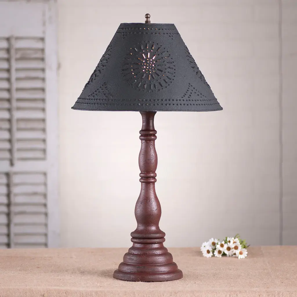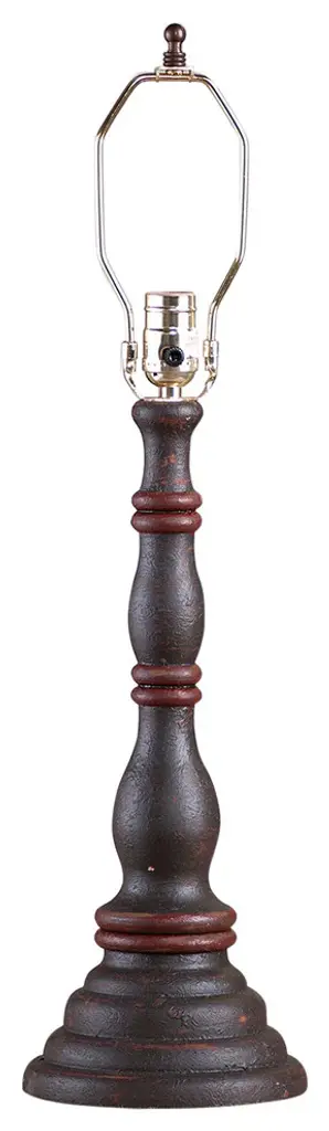 Measures 25.5-Inches high and 7-Inches in DiameterHas a 7-foot cord and line switch; Plugs into wall outlet; Standard socket, 1 x 150 watts maximum watts. UL listed for dry locationsTextured espresso with brick stripes paint finish; Shade not includedMade In USAA medium sized lamp base that will work well in your office, family room, or entryway. A neat looking lamp base with a distressed, textured paint finish. One single E26/Medium (Standard) socket, 150 watts maximum. Americana Espresso with Salem Brick Stripes body color. This lamp is handcrafted in Pennsylvania. This lamp base is UL-CUL approved and has a 5 year guarantee.