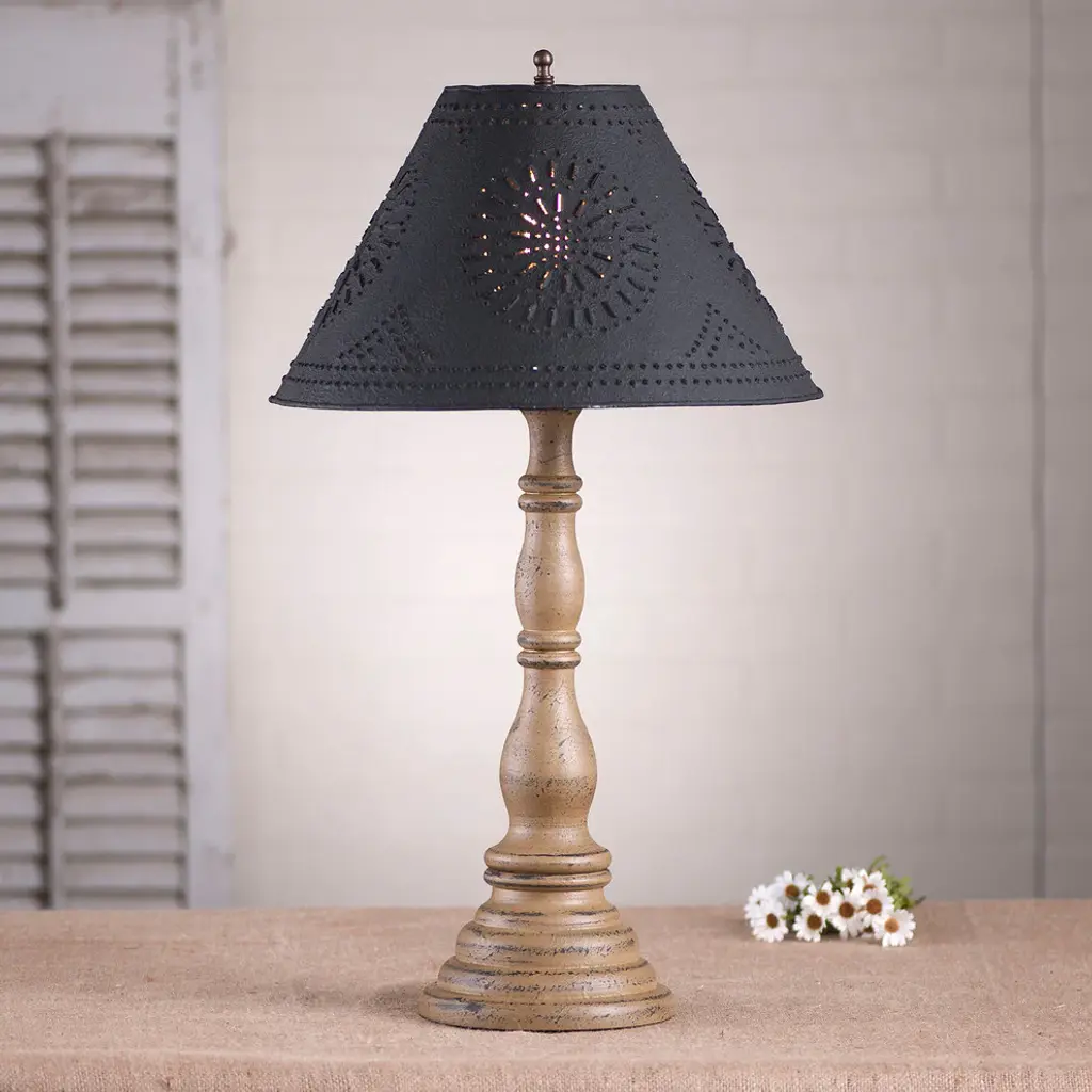 Measures 25.5-Inches high and 15-Inches in DiameterHas a 7-foot cord and line switch; Plugs into wall outlet; Standard socket, 1 x 150 watts maximum watts. UL listed for dry locationsTextured pearwood paint finish; Black textured shade includedLamp Base is made in the USA, Shade is Importeda medium sized lamp that will work well in your office, family room, or entryway. A neat looking lamp with slightly distressed and textured painted finish.One single E26/Medium (Standard) socket, 150 watts maximum. Slightly textured and distressed finish. Americana Pearwood painted body. Handcrafted in Pennsylvania. Includes a 15-Inch Textured Black Flared Shade #925-2CBK. Lamp base without shade and alternate shade options are shown under related items below.