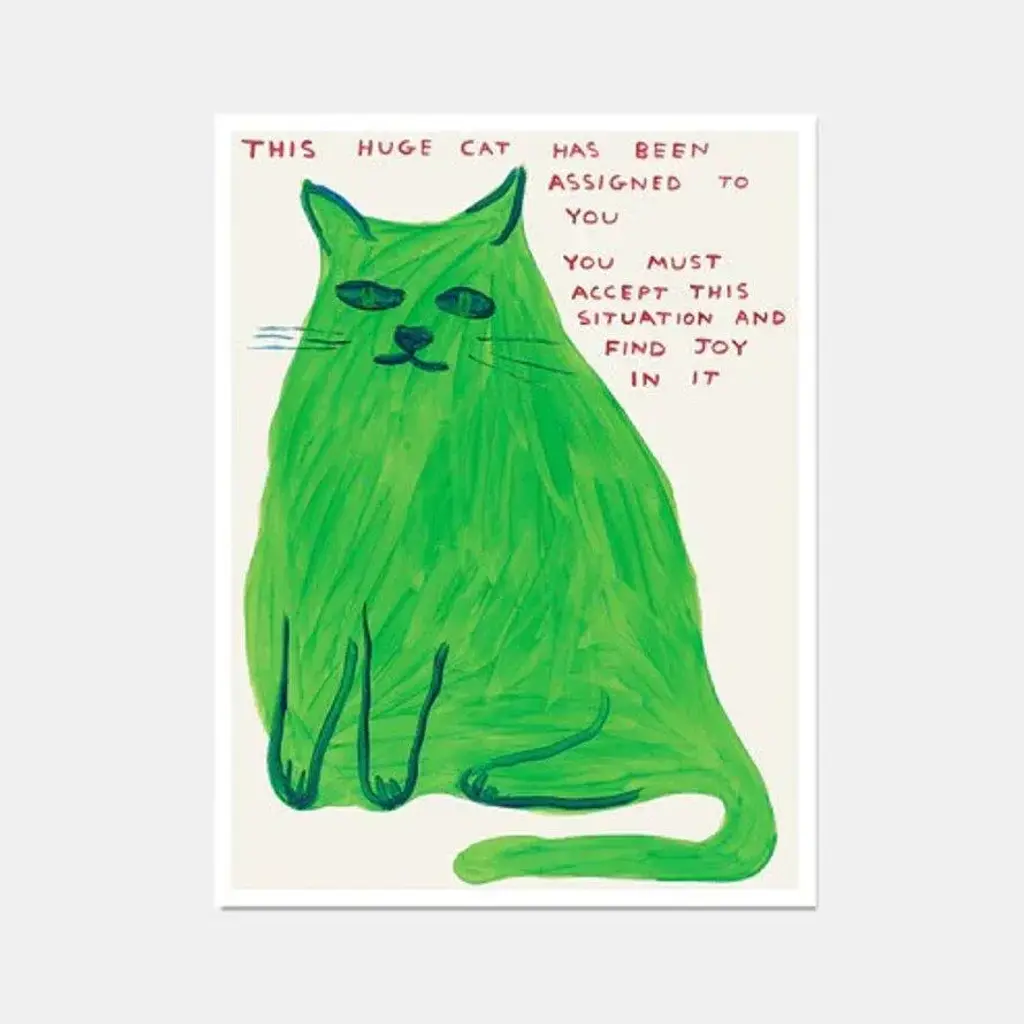 David Shrigley, This Huge Cat, 2022 Printed on 200g Munken Lynx paper by Narayana Press in Denmark 60 x 80 cm (23.62 x 31.50 in) Open edition Accompanied by a Certificate of Authenticity A huge green cat sits smuggly on a white background. Red text, above, reads 'This huge cat has been assigned to you' / 'You must accept this situation and find joy in it' David Shrigley, born in Macclesfield in 1968, is a British artist based in Brighton. Having graduated from the Glasgow School of Art in 1991, Shrigley has since gained international recognition for his distinctive drawings, sculptures, and text-based works. Known for his dark humour and deliberately crude style, Shrigley explores the absurdities of everyday life with wit and sharp social commentary. A 2013 Turner Prize nominee, his work has been exhibited globally. Numbered