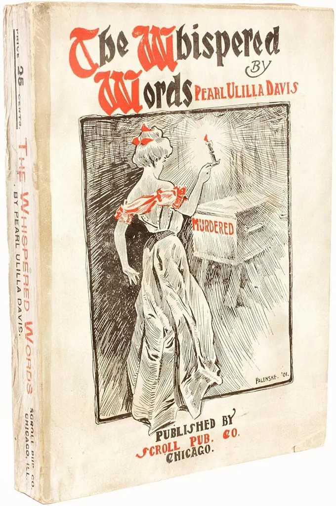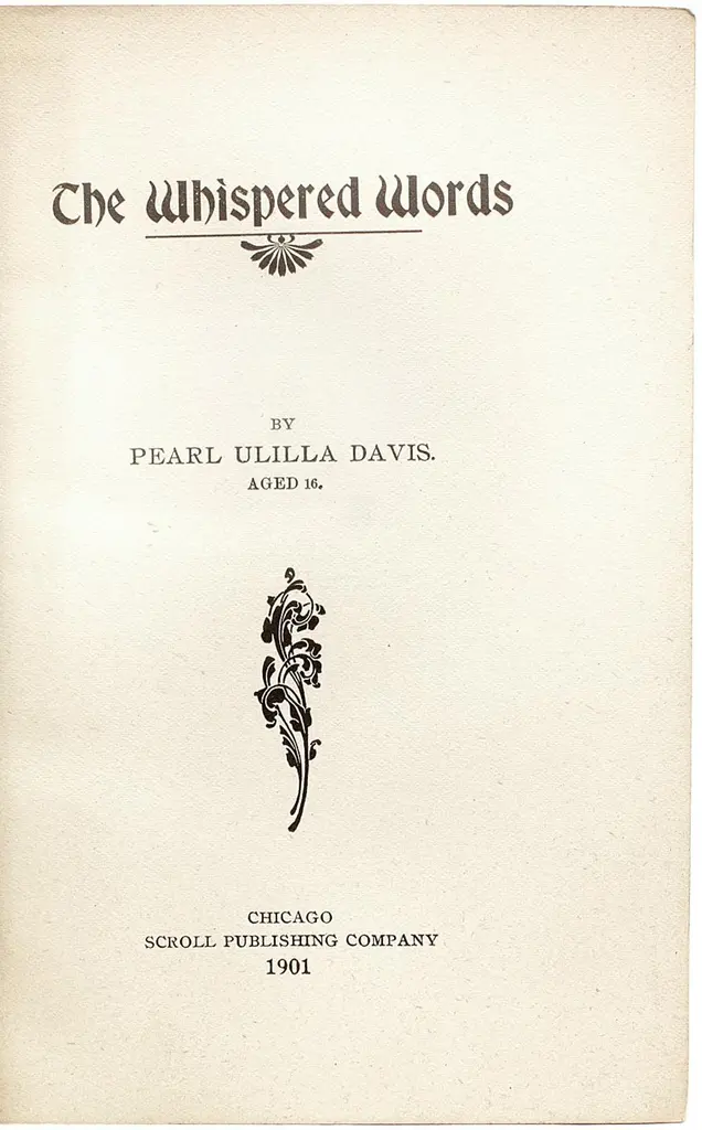 AUTHOR: DAVIS, Pearl Ulilla. TITLE: The Whispering Words.PUBLISHER: Chicago: Scholl Pub. Co., 1901.DESCRIPTION: FIRST EDITION. 1 vol., 6-11/16" x 5", (i)238pp., frontis portrait plate, pictorial front wrapper.CONDITION: Internally clean and bright, hinges and spine fine, a VERY GOOD copy.ADDITIONAL INFORMATION: No copy has ever appeared at auction and OCLC locate one 1 copy in institutional library's.