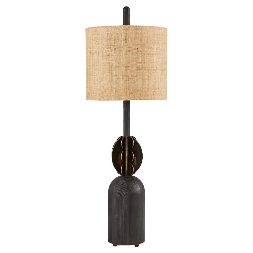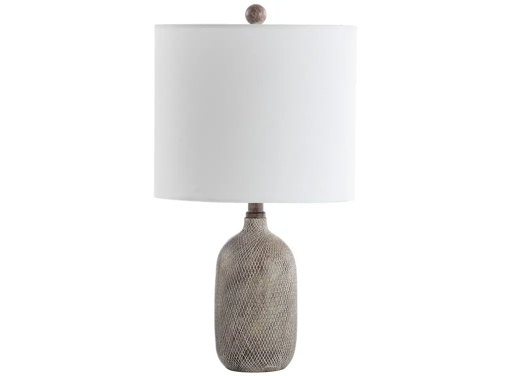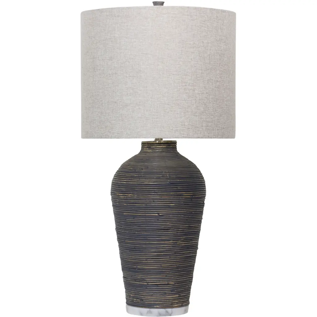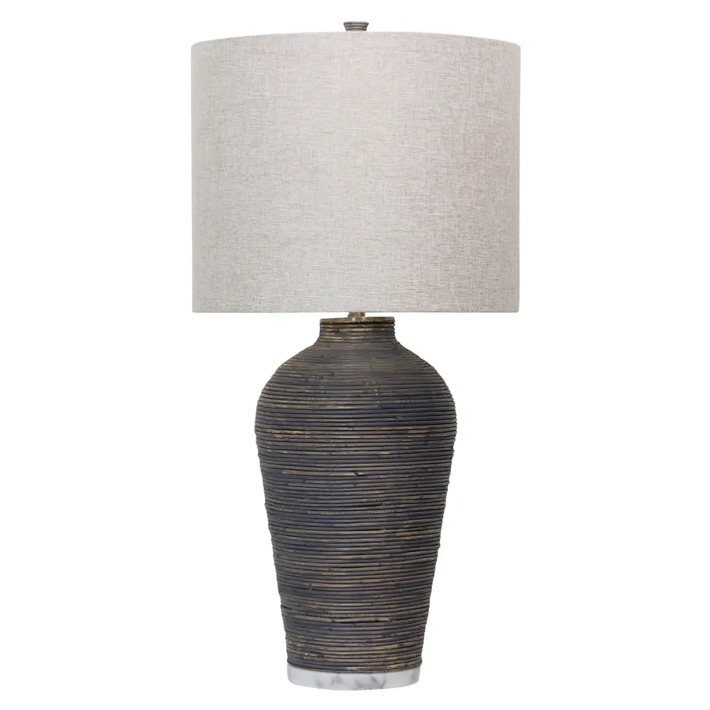 A simple column base is enlivened by striking textural details with this table lamp. Davol is crafted of resin with white highlights for a weathered look, its ridged midsection creating definition and an eye-catching focal point. The white linen shade offsets the rustic feel with a tailored finishing touch and intriguing material counterpoint. Perfect for a modern farmhouse or summer setting.