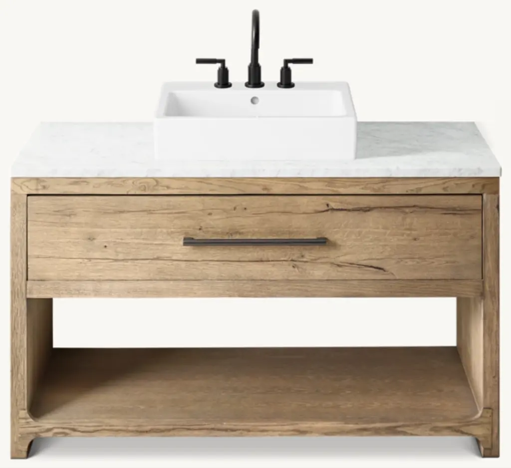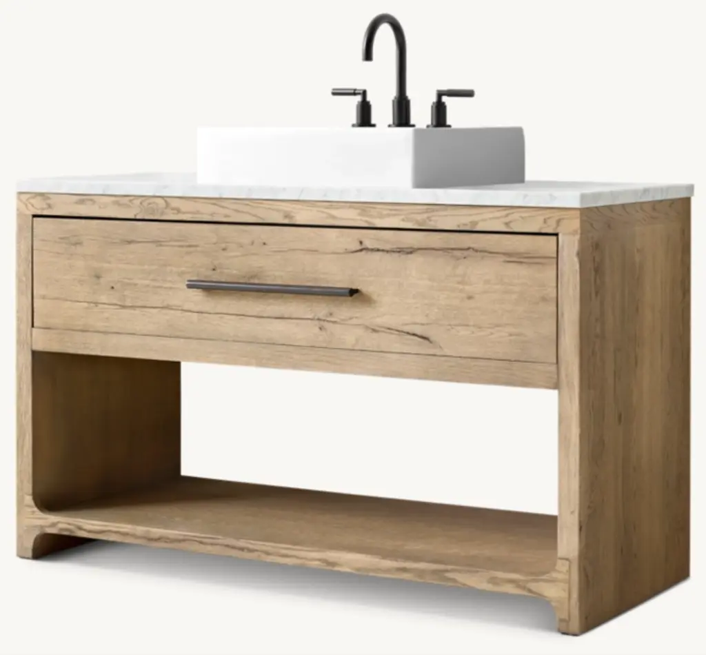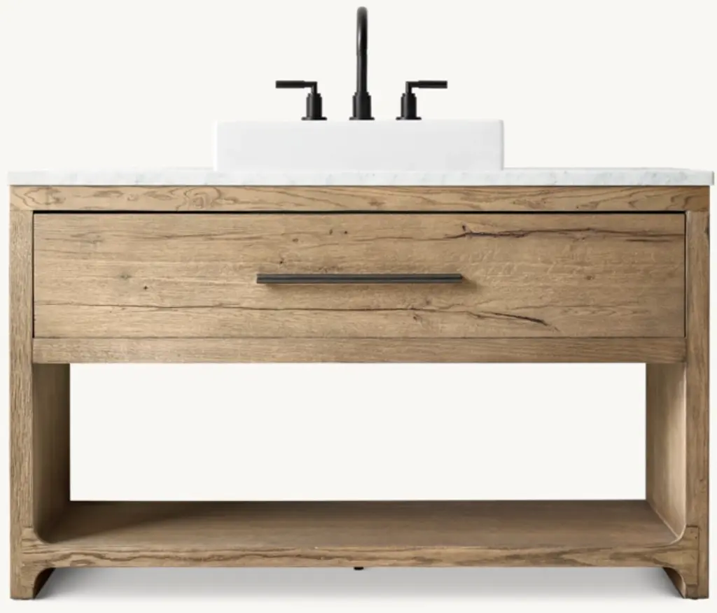 Inspired by the 1970s use of bold lines and natural forms, the Davos collection by Australians Harrison and Nicholas Condos is built on a heroic scale. The spare silhouettes, rendered in thick veneers of American white oak, reveal an intriguing juxtaposition of crisp angles and rounded corners. The oak's texture is enhanced by a high-heat finishing process that creates distinctive cracks and purposeful imperfections, a celebration of the wood's character and unique grain patterning. The ceramic vessel basin is sustainably crafted in Italy. SHOP THE ENTIRE COLLECTION