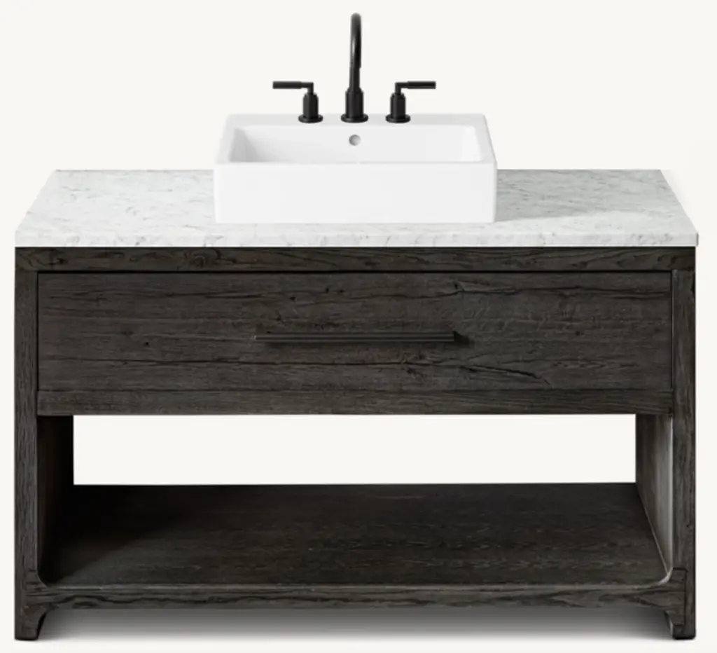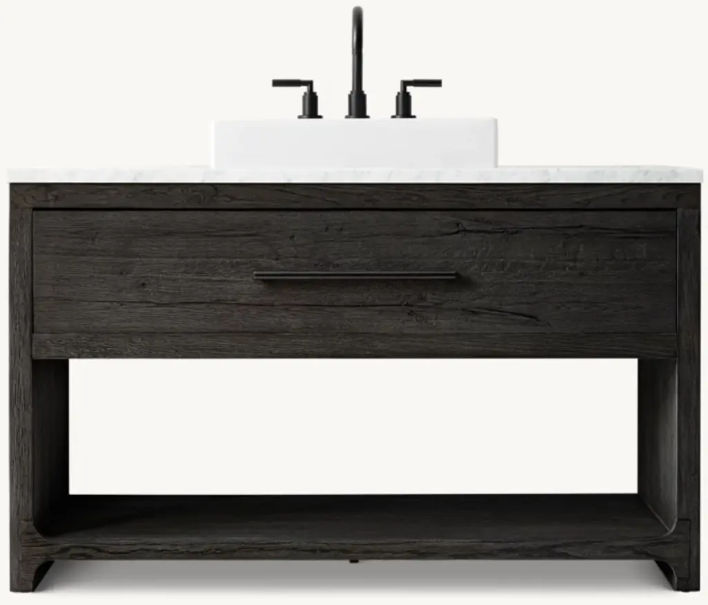 Inspired by the 1970s use of bold lines and natural forms, the Davos collection by Australians Harrison and Nicholas Condos is built on a heroic scale. The spare silhouettes, rendered in thick veneers of American white oak, reveal an intriguing juxtaposition of crisp angles and rounded corners. The oak's texture is enhanced by a high-heat finishing process that creates distinctive cracks and purposeful imperfections, a celebration of the wood's character and unique grain patterning. The ceramic vessel basin is sustainably crafted in Italy. SHOP THE ENTIRE COLLECTION