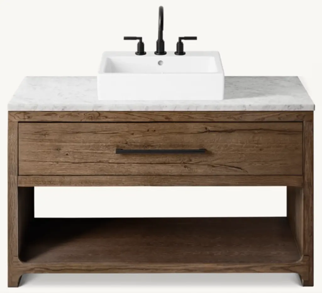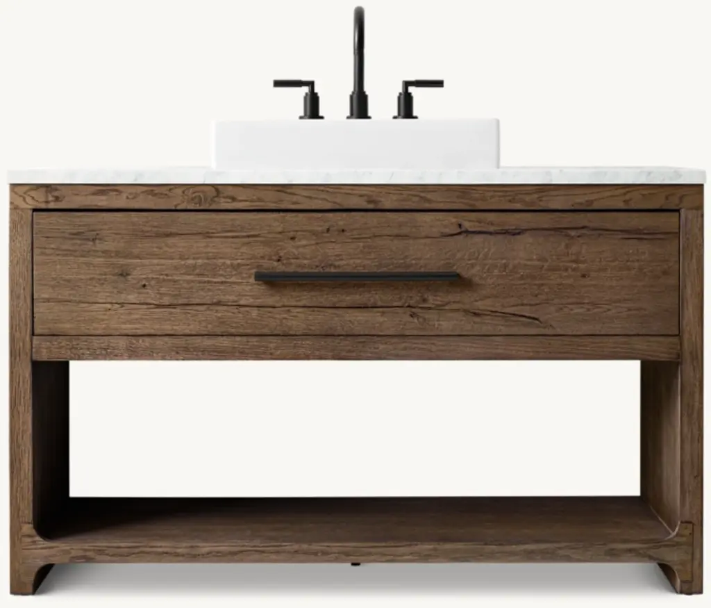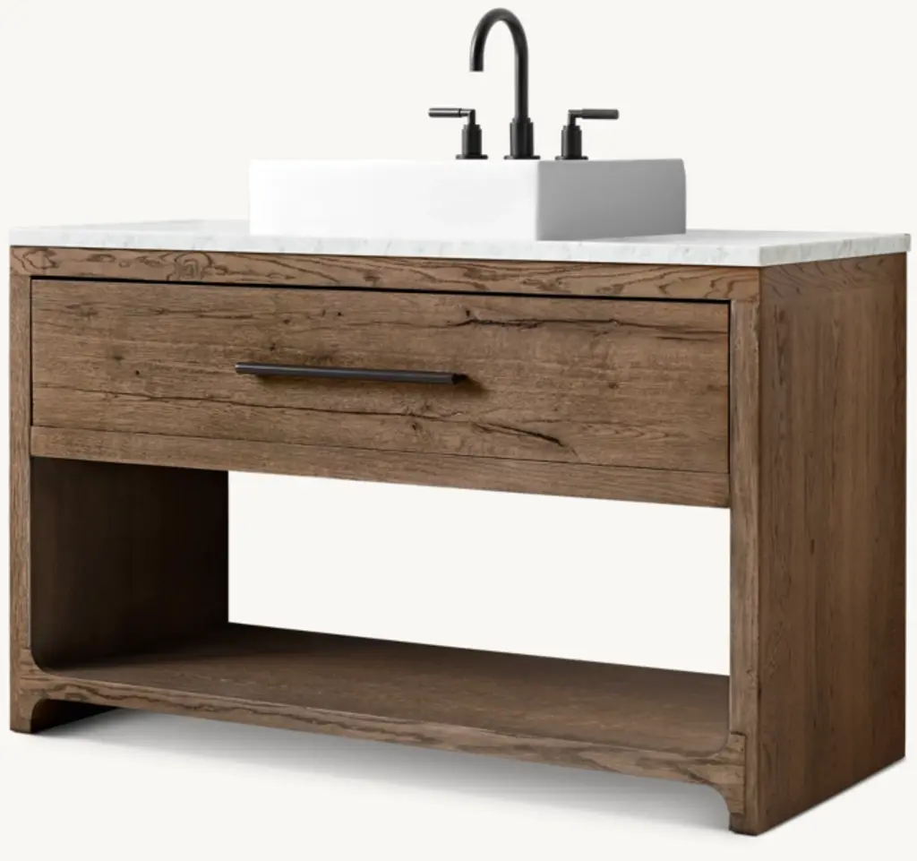 Inspired by the 1970s use of bold lines and natural forms, the Davos collection by Australians Harrison and Nicholas Condos is built on a heroic scale. The spare silhouettes, rendered in thick veneers of American white oak, reveal an intriguing juxtaposition of crisp angles and rounded corners. The oak's texture is enhanced by a high-heat finishing process that creates distinctive cracks and purposeful imperfections, a celebration of the wood's character and unique grain patterning. The ceramic vessel basin is sustainably crafted in Italy. SHOP THE ENTIRE COLLECTION