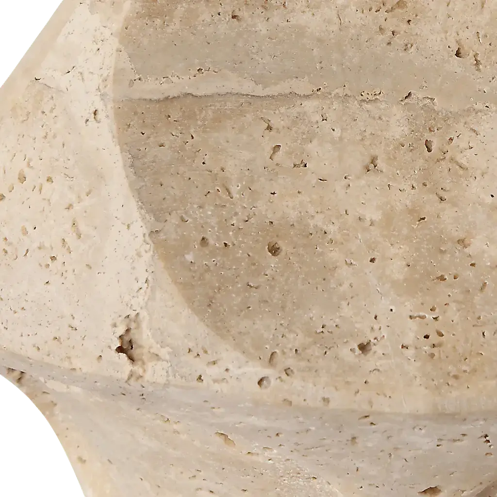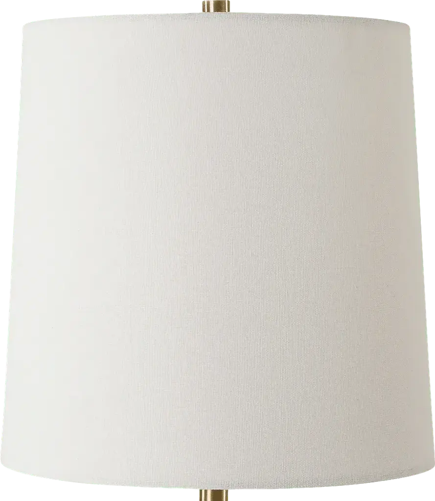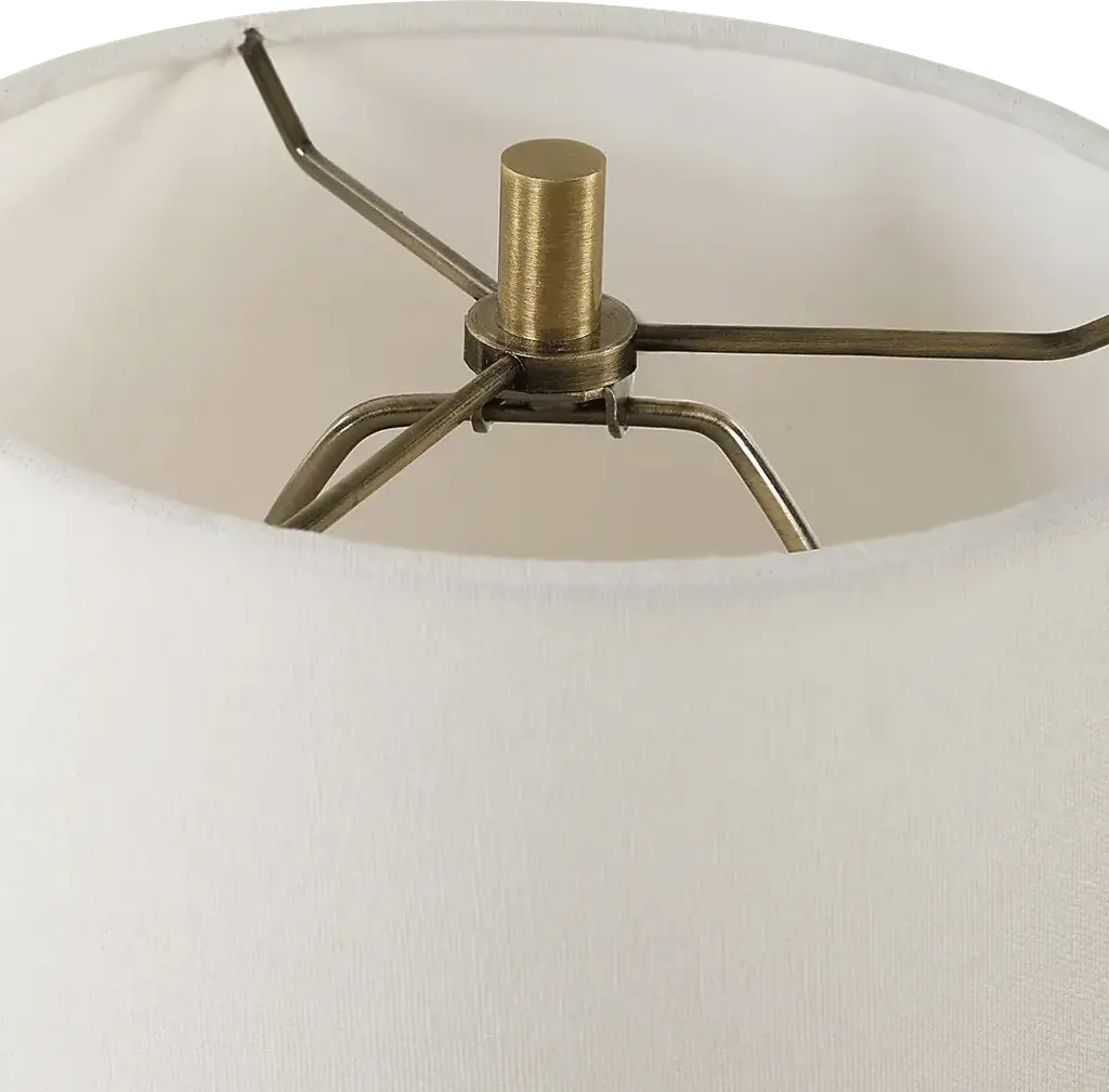 The Dawes Reef Beige Lamp features a scooped-out travertine base paired with plated antique brass accents. The slightly tapered round hardback shade is covered in white linen fabric. Partial assembly may be required.