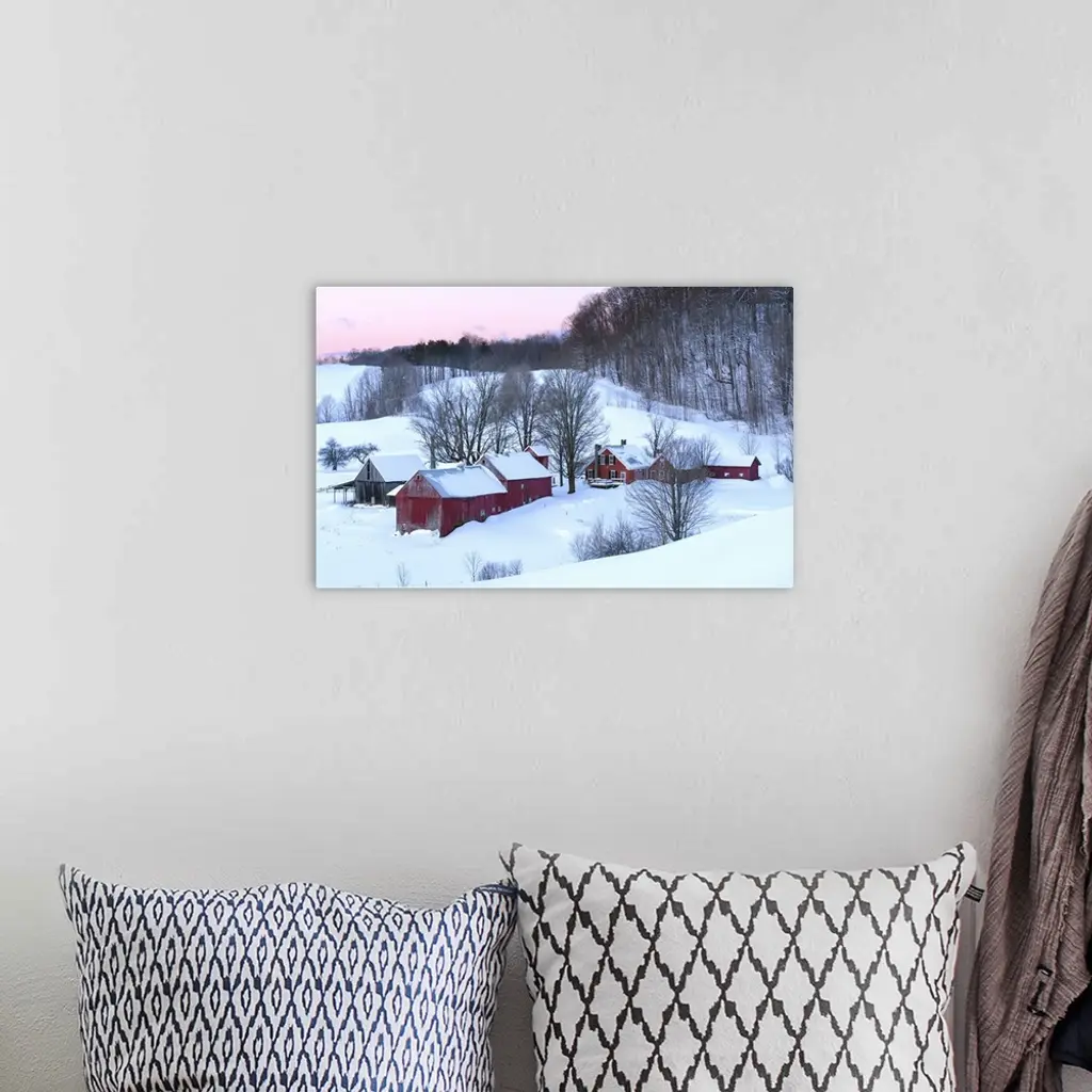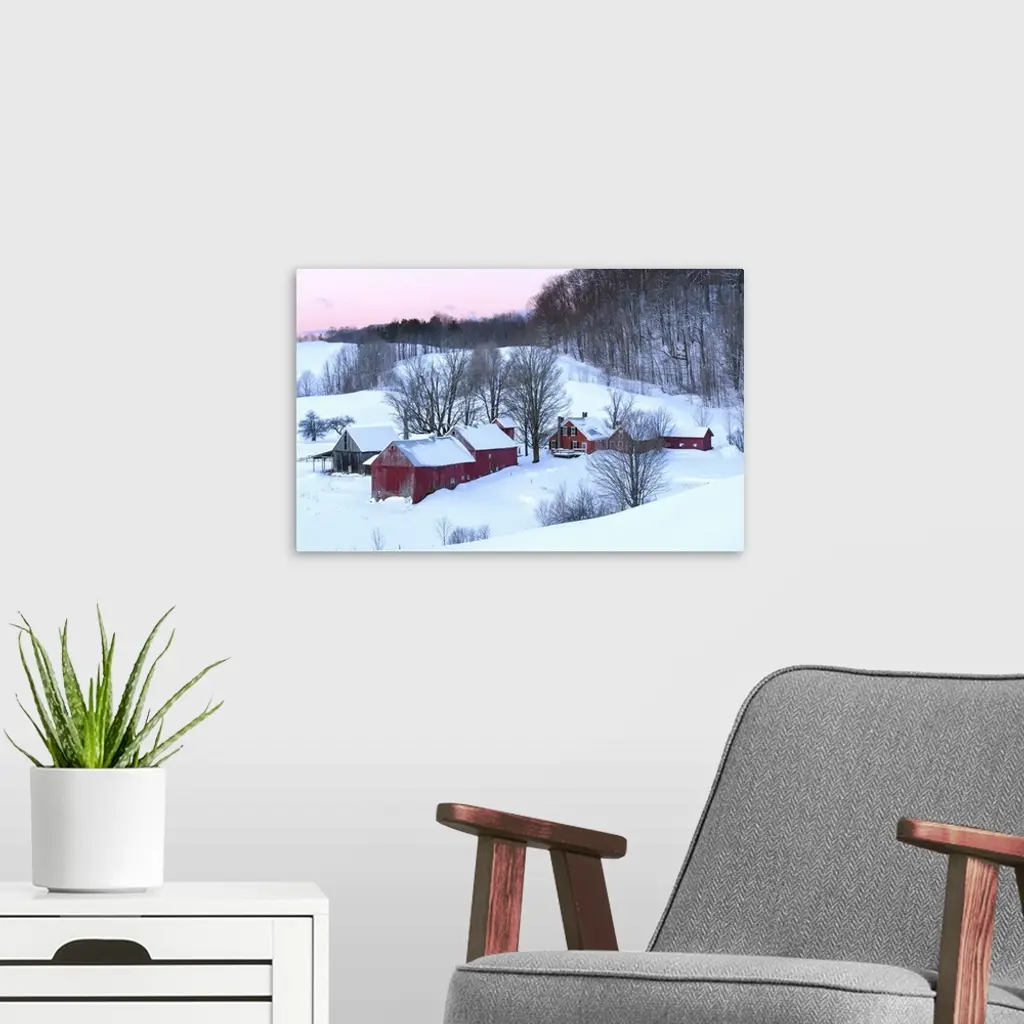 Photograph of a snowy rolling hills with red buildings and bare Winter trees at sunrise.