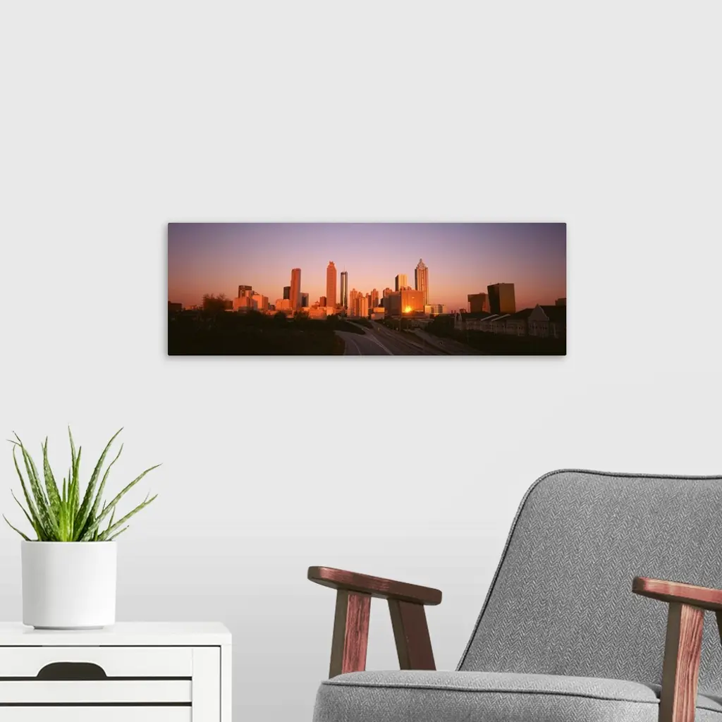 Giant, horizontal photograph of the sun rising over the Atlanta skyline, several roads and a row of buildings can be seen in the foreground.