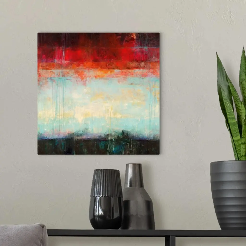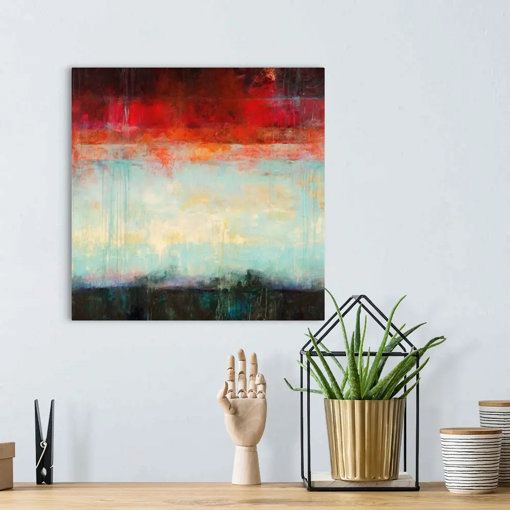 Square abstract landscape of horizontal wide brush strokes of red, blue, cream and black with drips of paint below.