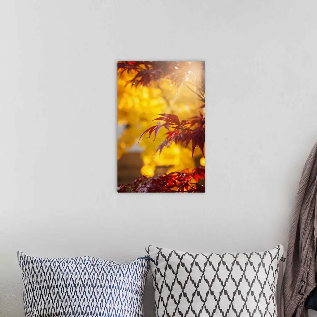 Sunlight shining though fall foliage in a forest.