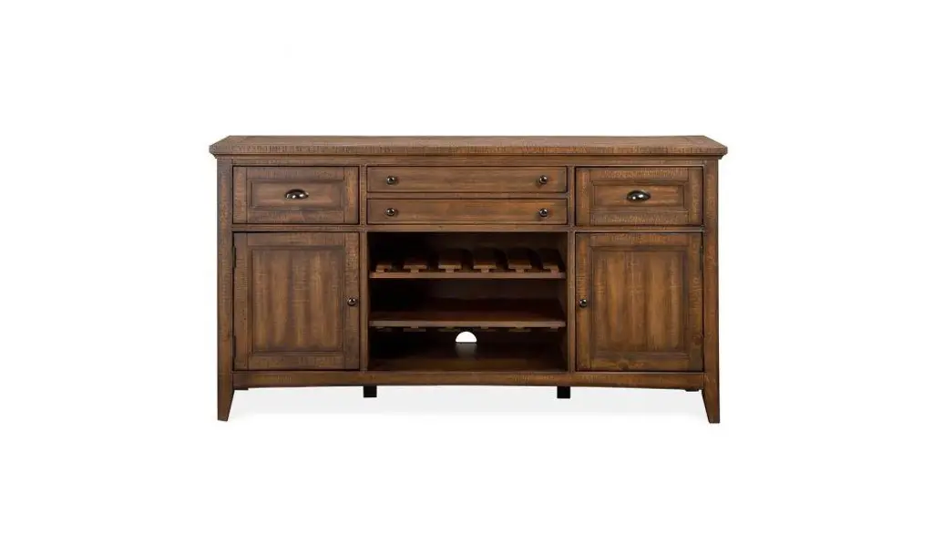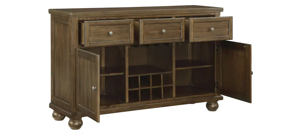 Daye Collection lends timeless appeal to the look of your casual dining space. With subtle hints nodding to the Arts and Crafts design movement, the server features classic lines that solidify the versatile aesthetic of the collection. The server has drawer and behind door storage allowing for quick and convenient access to your decorative tabletop items as well as a wine rack and stemmed glassware rack. A traditional cherry finish is utilized to highlight the collection's acacia veneer.