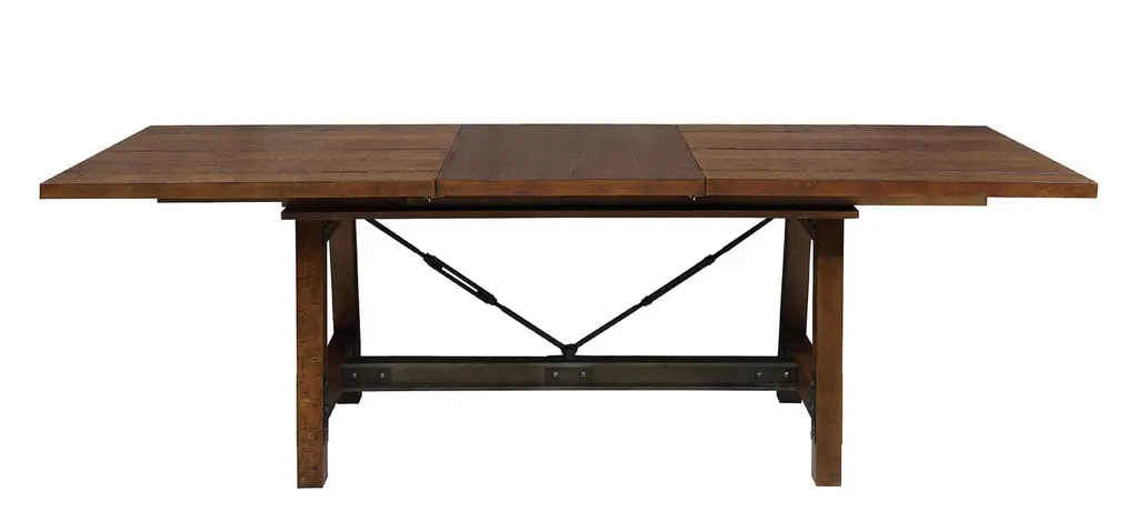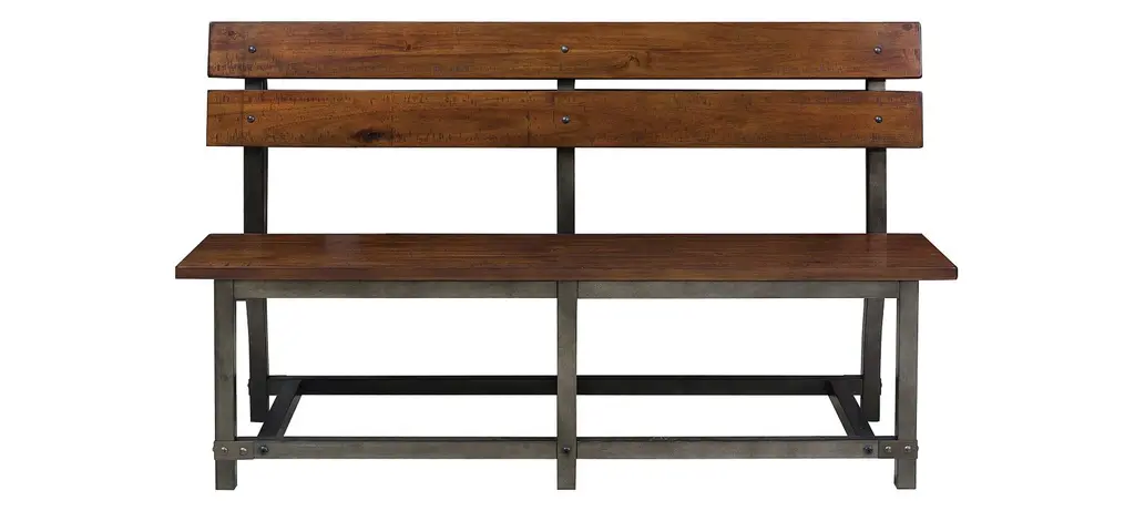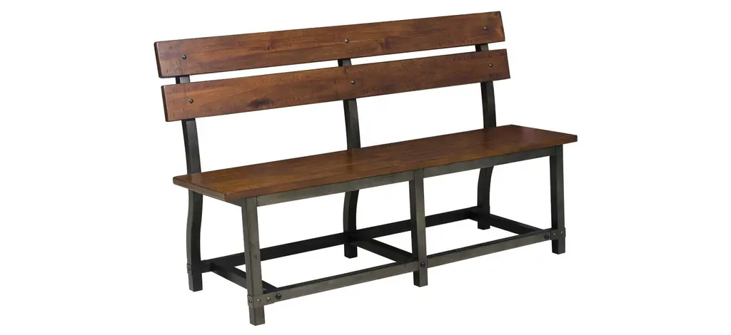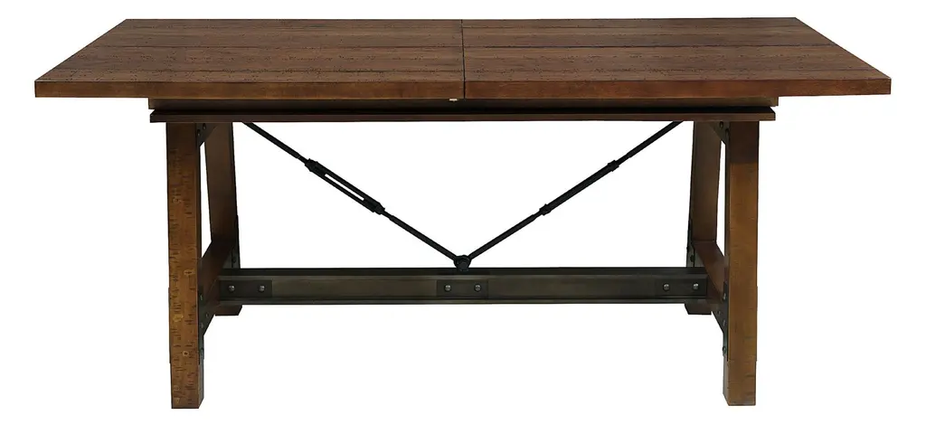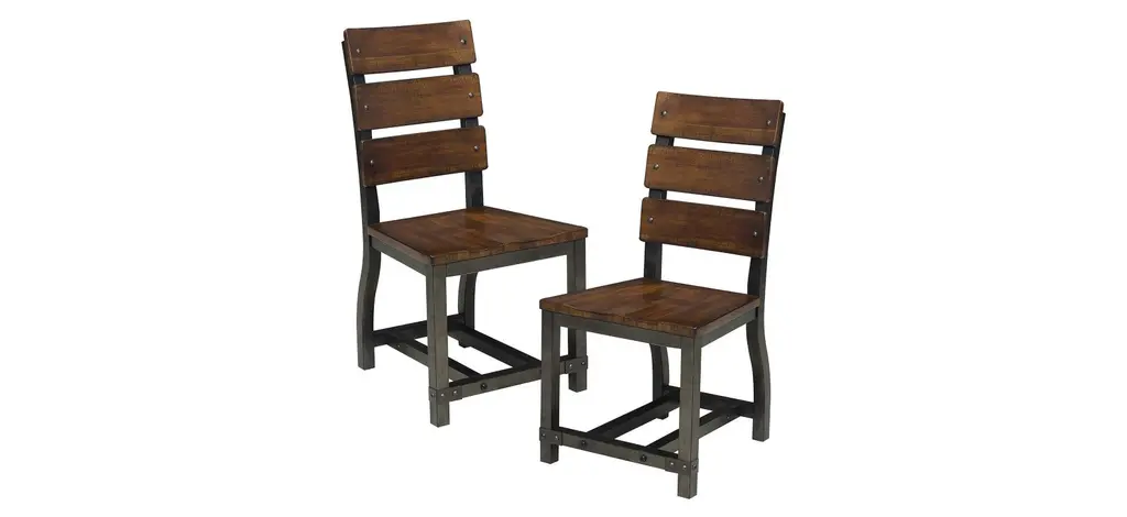 Heavily influenced by industrial design, the Dayton dining set will lend a unique look to your personal space. Gunmetal finished wood framing provides sturdy structure and profile to each piece in this collection. Faux rivets provide additional detail to the metal bracketing that is prominently on display. Rectangular dining height table allows for perfect placement within your casual dining space. Side chair for both table heights present the opportunity to customize seating to fit your lifestyle. A rustic brown milk crate finish is utilized to highlight the acacia veneer. The open display hutch paired with the drop front server base, provides ample display and behind door storage for your tabletop accessories.