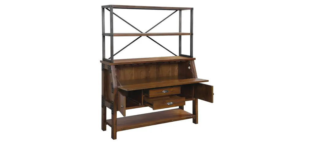 Heavily influenced by industrial design, the Dayton bakers rack will lend a unique look to your personal space. Gunmetal finished wood framing provides sturdy structure and profile. Faux rivets provide additional detail to the metal bracketing that is prominently on display. A rustic brown milk crate finish is utilized to highlight the acacia veneer. The open display hutch paired with the drop front server base, provides ample display and behind door storage for your tabletop accessories.
