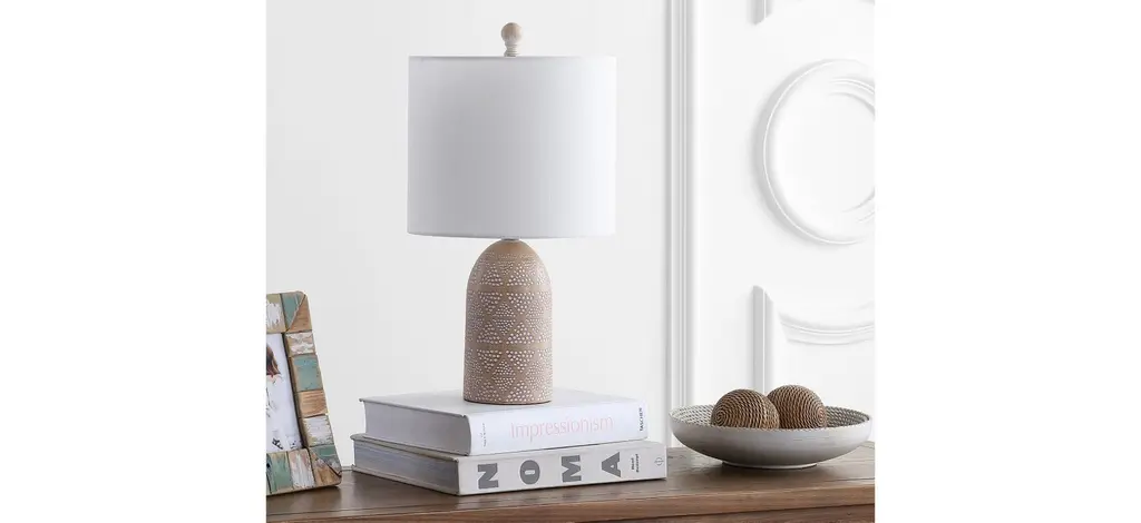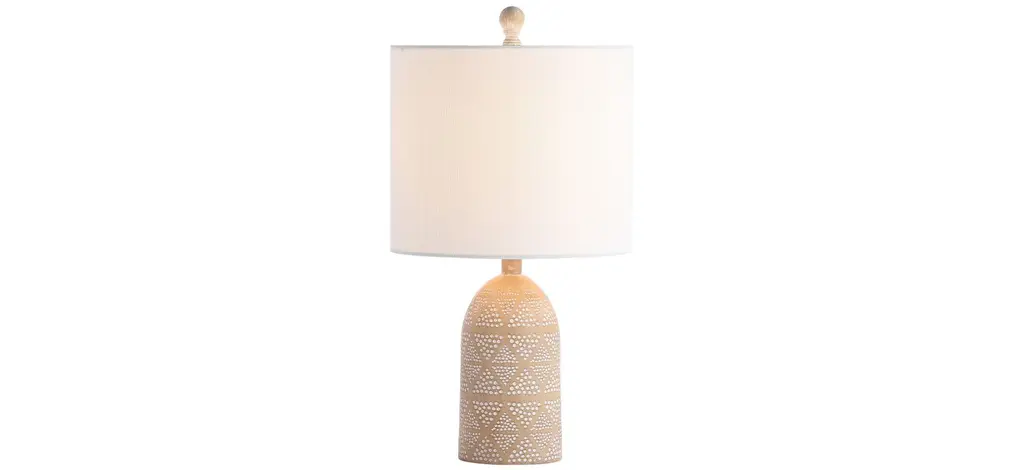 Subtle and chic, this contemporary Dayton Table Lamp is a design investment. A new classic, its neutral brown palette, timeless polka dot pattern, and elegant curves transform any living room. Its generously sized off white 100% cotton shade and brown finial are ideal for any decor.