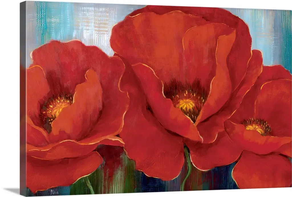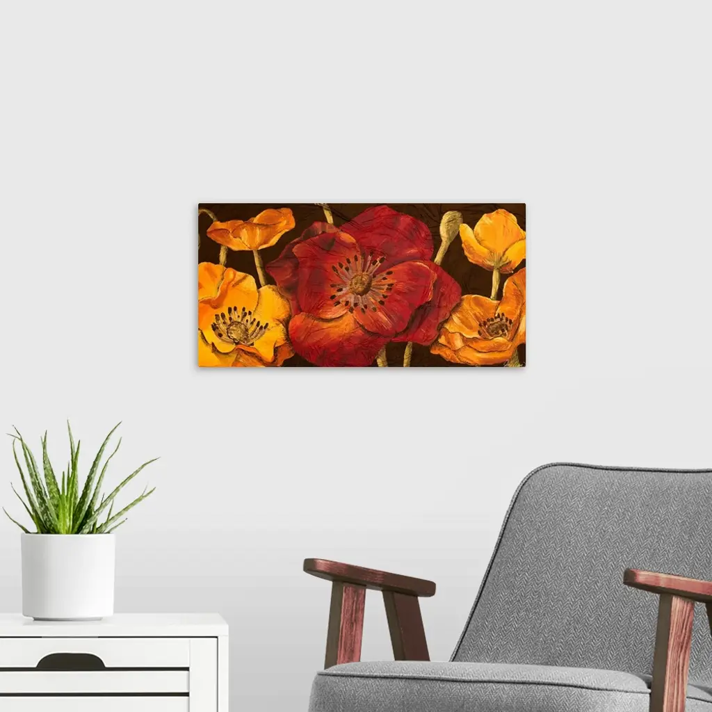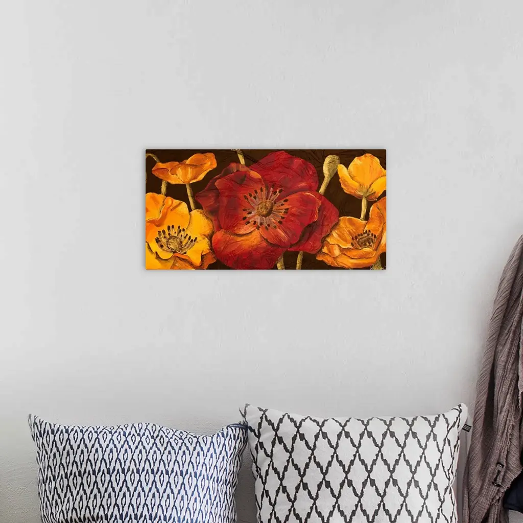 Panoramic contemporary art depicts a group of poppy flowers and buds sitting against a earth toned background.