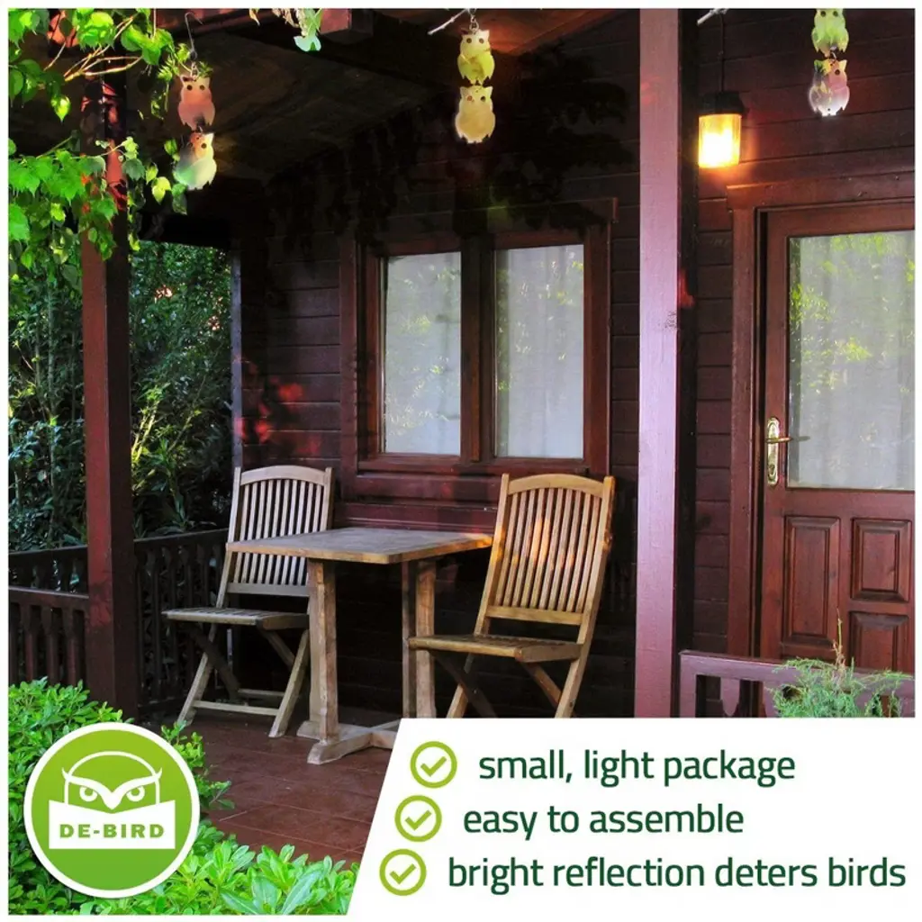STRONG REFLECTIVE OWL DISCS 8 Sets of Bird Deterrent, owl for bird control, bird detractors, bird deterrence, bird deterant, owl for scaring birds or bird deterrent for house discs which swivel & use reflectors in sunlight to scare birds away. The decoy owls to scare birds or bird repellant devices offer a safe way of protecting your property. EASY TO FIT ANYWHERE Safe & easy to install bird reflectors, bird away tool, bird repellent outdoor, bird prevention devices, bird deterrent outdoor, bird deflectors, bird repellents, how to keep birds away from porch, fruit tree bird deterrent or owl bird deterrent - hang in windows to prevent bird window strikes. Keeps the birds safe as well as your property! SAFELY SCARES AWAY BIRDS The Owl bird repellent devices, owl bird deterent, bird repellent owl, bird repellent decoy or owl woodpecker deterrent can hang anywhere that has access to wind & light such as balconies, trees and eaves of buildings.