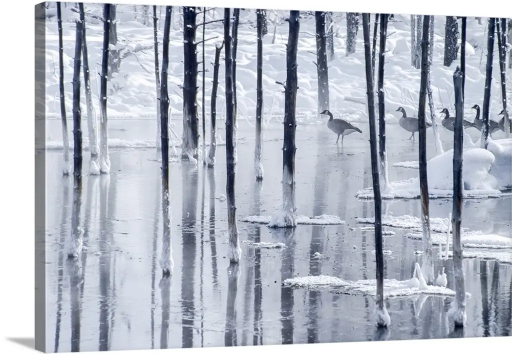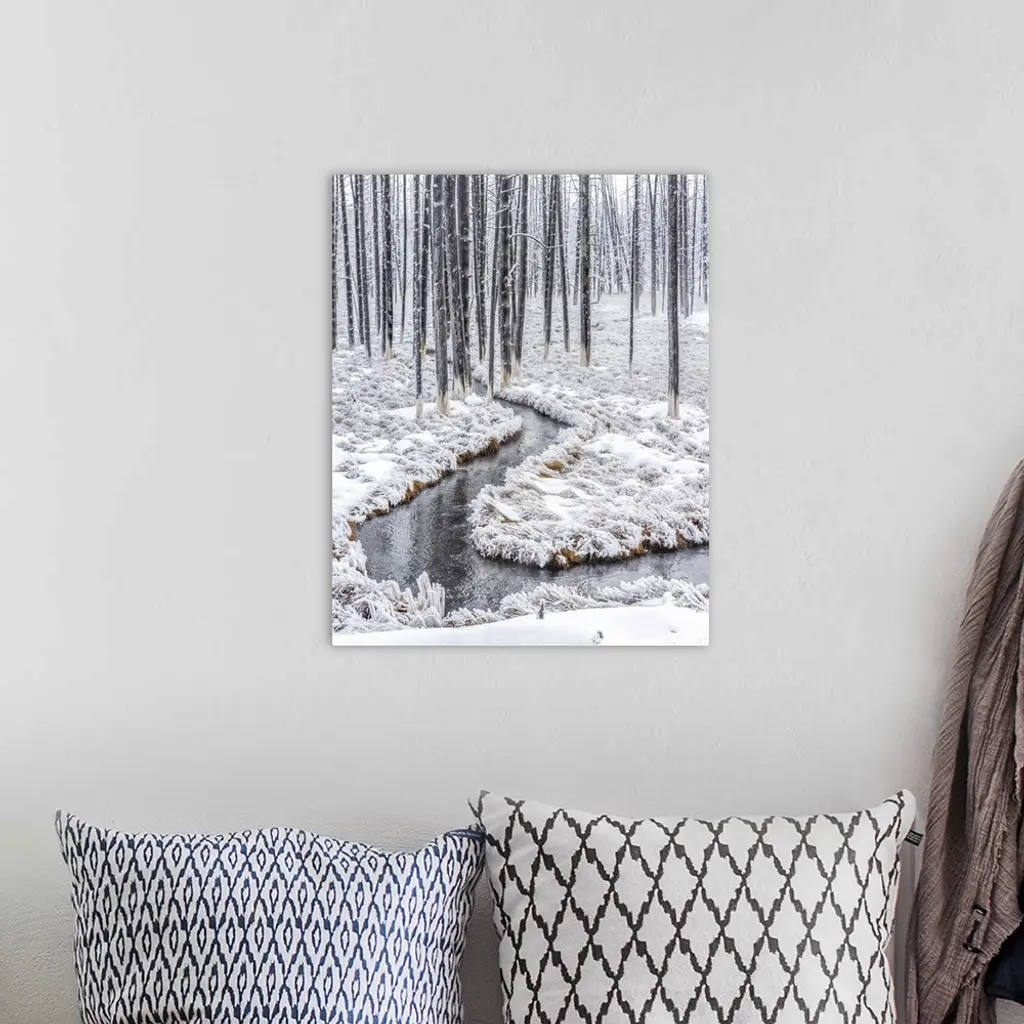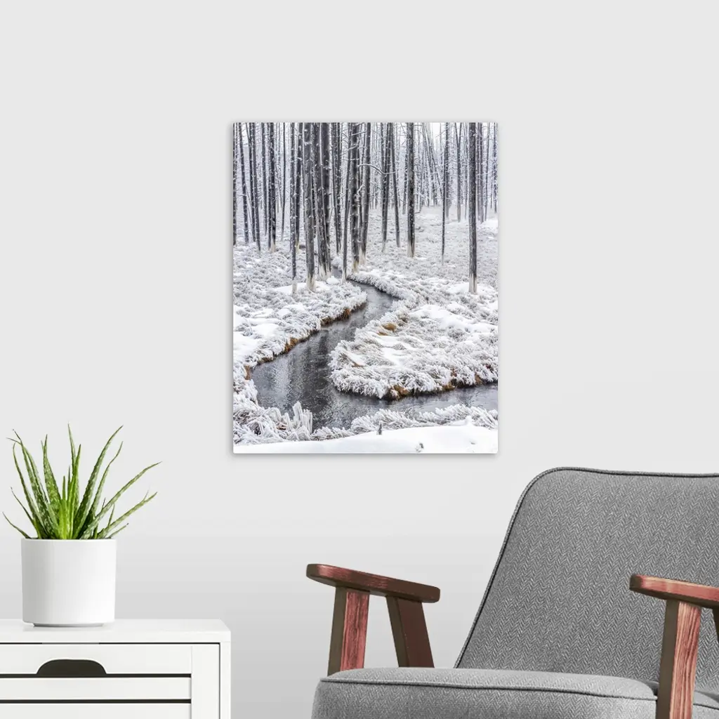 Dead lodgepole pine trees (Pinus contorta) with a thermal runoff channel in the Lower Geyser Basin, also known as bobby sox trees due to the white, mineral deposit residue left behind when the water evaporates, with frost covered marsh grasses in winter Yellowstone National Park, Wyoming, United States of America
