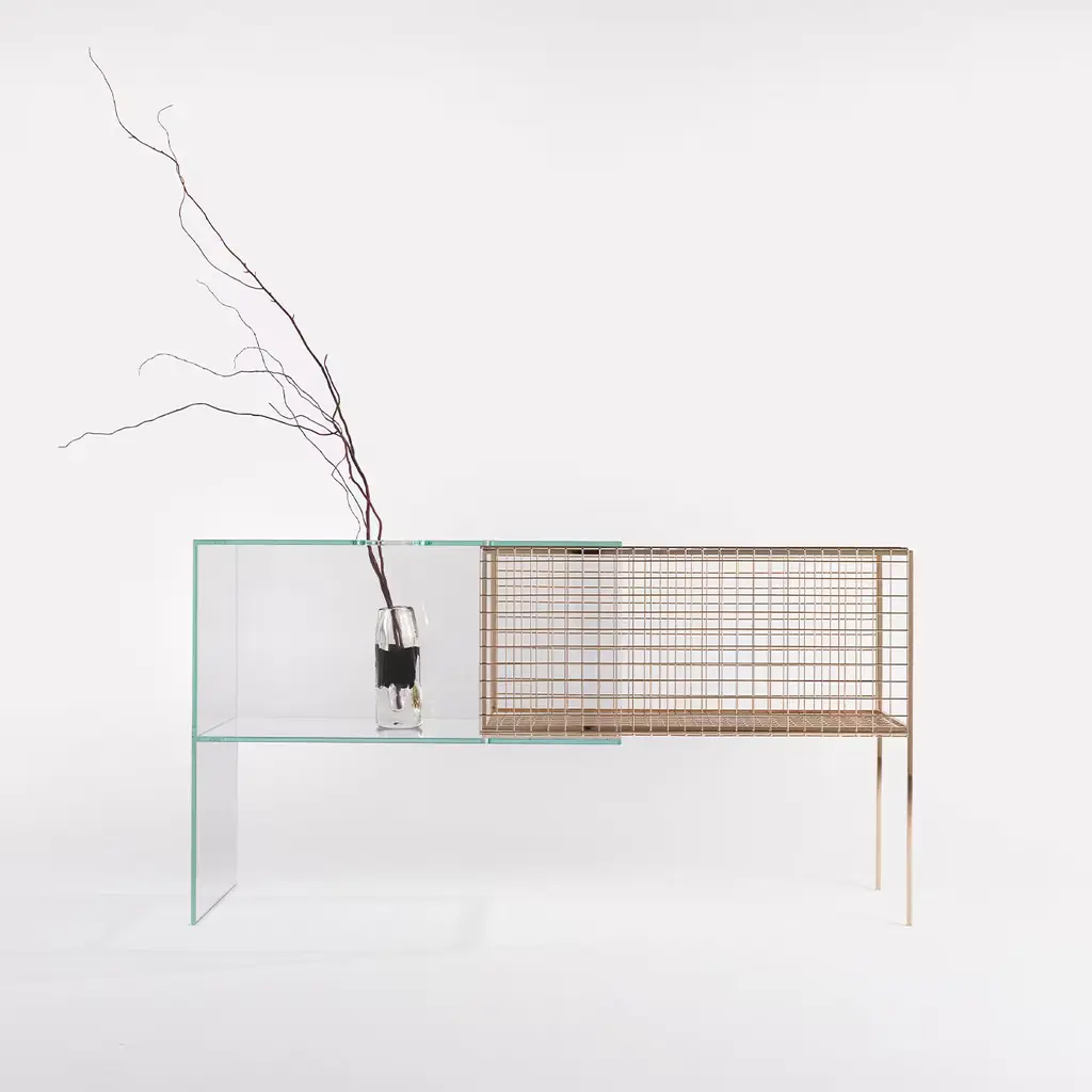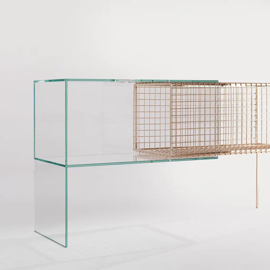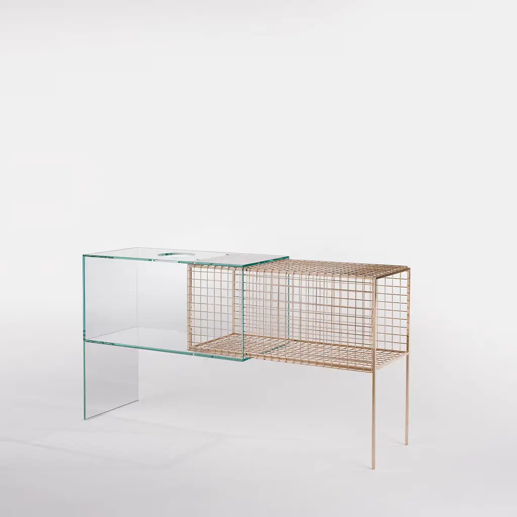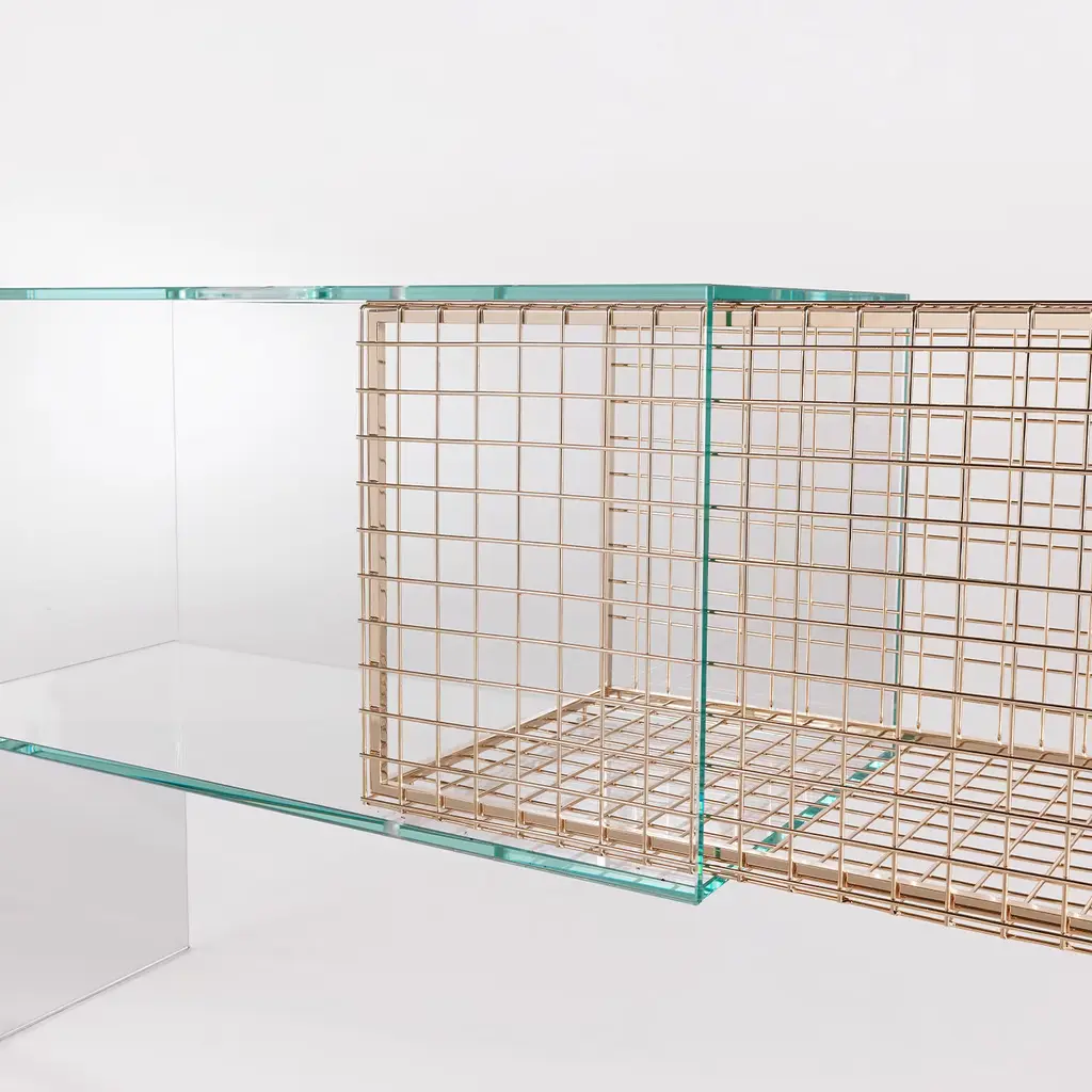 "Information technology and geometric shapes drawn inside of an ideal cage that determines mathematically their precision. Debeam makes the invisible visible: its dogmatic lines materialize, acquiring aesthetic value, while the geometrical solid fades. A console with a double soul that contains and exposes at the same time." Console made of two elements: one with metal structure enclosed with a welded metal cage in glossy gold finishing, and the other with an extra clear tempered glass structure with a circular opening on the top. The two structures are joint together, one inserted in the other, in the middle part. No variations Available.
