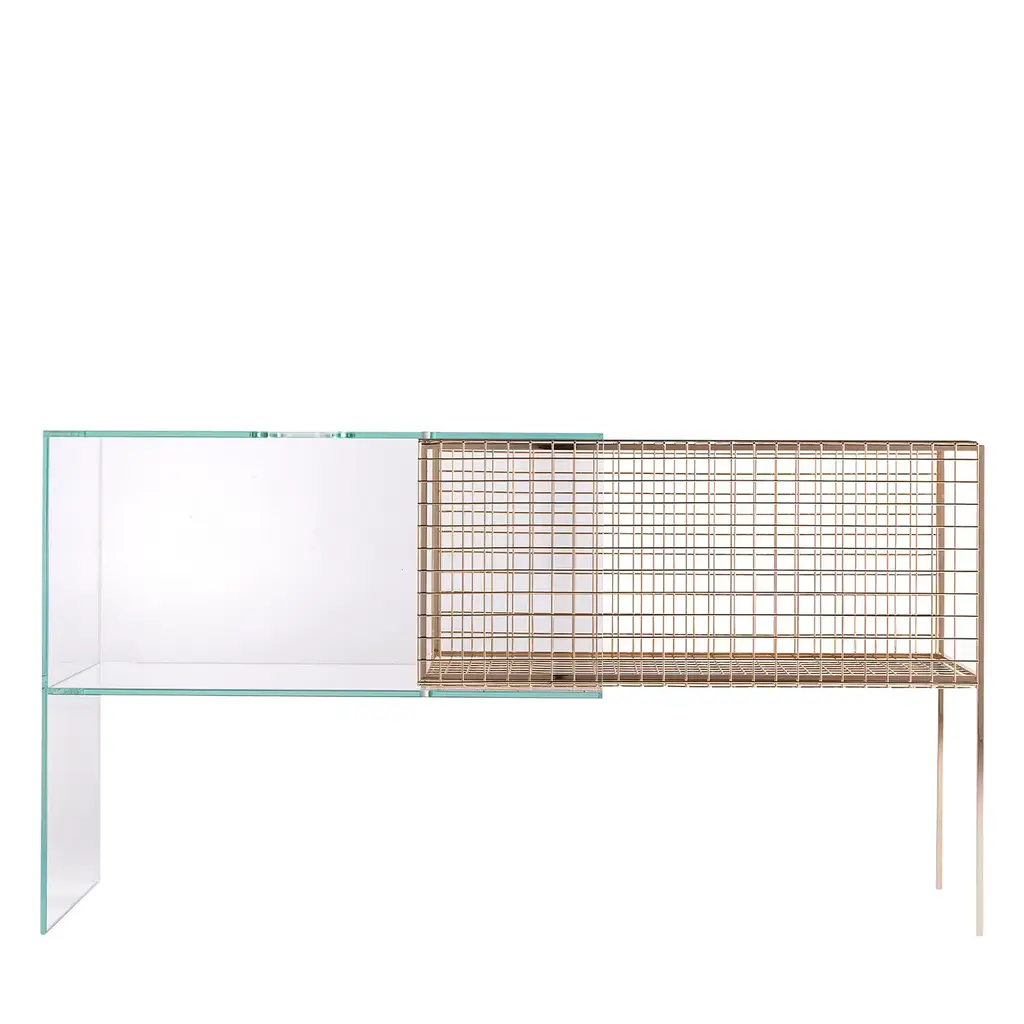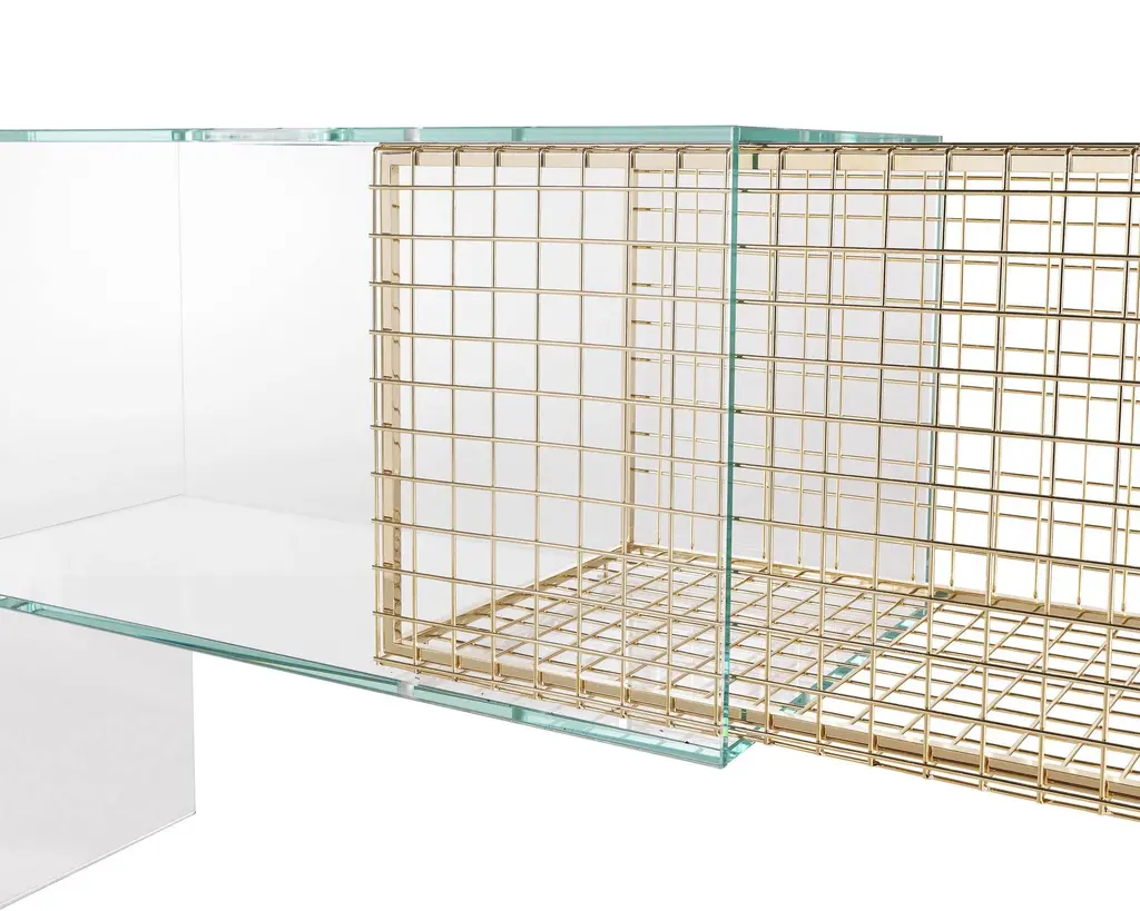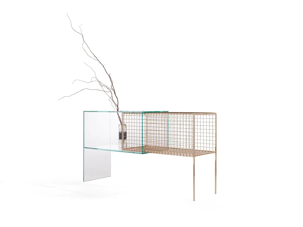 Information technology and geometric shapes are drawn inside of an ideal cage that determines mathematically their precision. Debeam makes the invisible visible: its dogmatic lines materialize, acquiring aesthetic value, while the geometrical solid fades. A console with a double soul that contains and exposes at the same time. Console made of two elements: one with metal structure enclosed with a welded metal cage in glossy gold finishing, and the other with an extra clear tempered glass structure with a circular opening on the top. The two structures are joined together, one inserted in the other, in the middle part. Labeled by Maker,Numbered,Labeled by Maker,Numbered