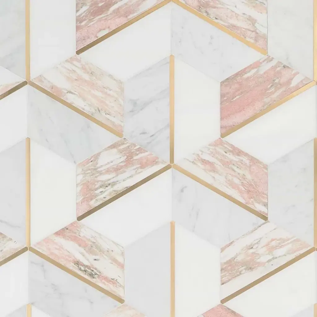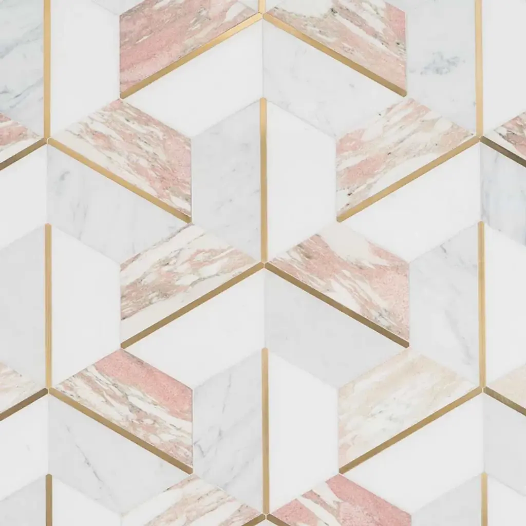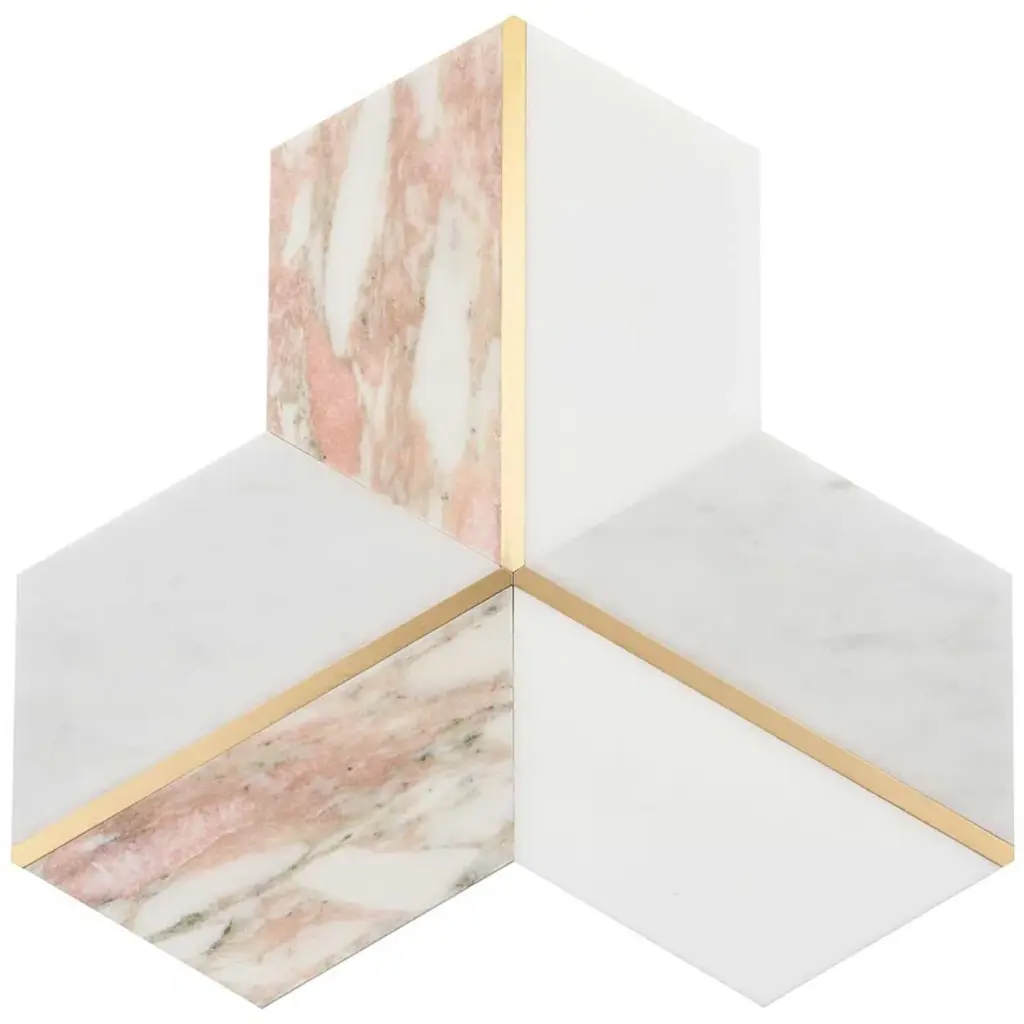 About The Tile: Elegant and romantic, the Decade Rosa Polished Marble and Brass Mosaic tiles are a luxurious combination of White Thassos, White Carrara, and Rosa Norvegia marbles. Finding inspiration in Art-Deco design, these mosaic tiles break the boundaries of the hexagon pattern, using color and shape to create a glamorously graphic visual. The naturally soft variations of the marble and the brass detail of these tiles elevate them from classic to glamorous.