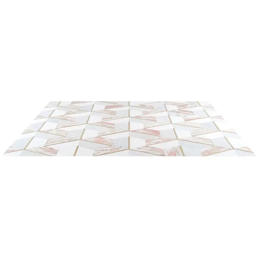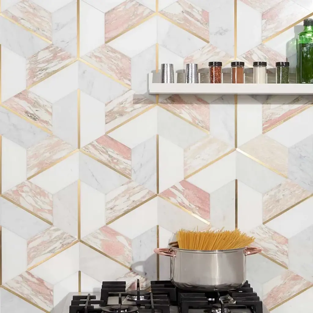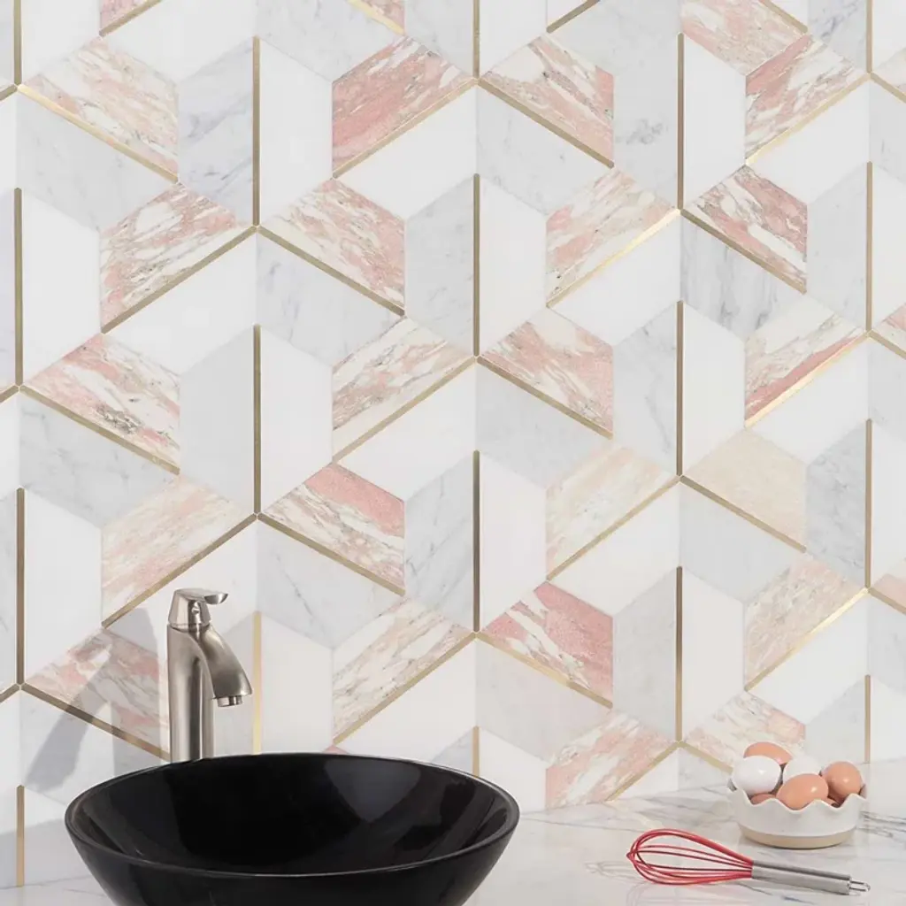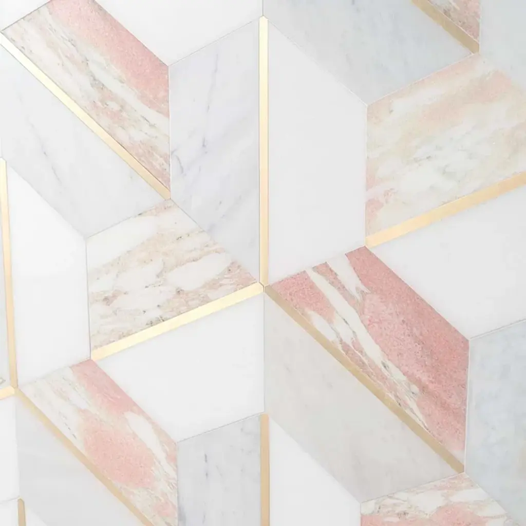About The Tile: Elegant and romantic, the Decade Rosa Polished Marble and Brass Mosaic tiles are a luxurious combination of White Thassos, White Carrara, and Rosa Norvegia marbles. Finding inspiration in Art-Deco design, these mosaic tiles break the boundaries of the hexagon pattern, using color and shape to create a glamorously graphic visual. The naturally soft variations of the marble and the brass detail of these tiles elevate them from classic to glamorous.
