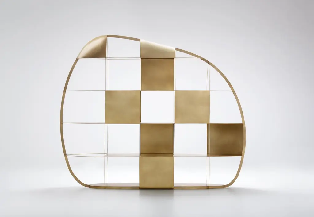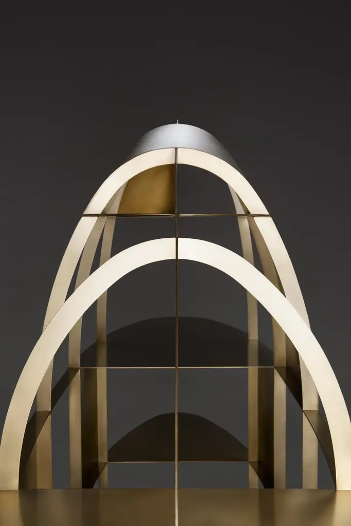 The Airframe bookcase celebrates the art of hammered metal, highlighting the savoir-faire and artisan virtuosity that define De Castelli.Its aerodynamic shape outlines a fine metal structure made of asymmetrical elliptical loops, supporting four discontinuous horizontal shelves. The outer shell is composed of a partial covering that has been expertly shaped to the structure.Micro architecture that makes any space more refined, adding a dramatic element to interiors.