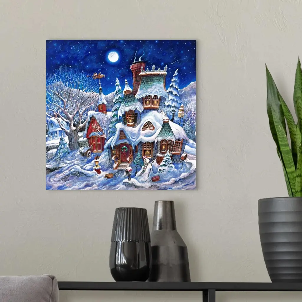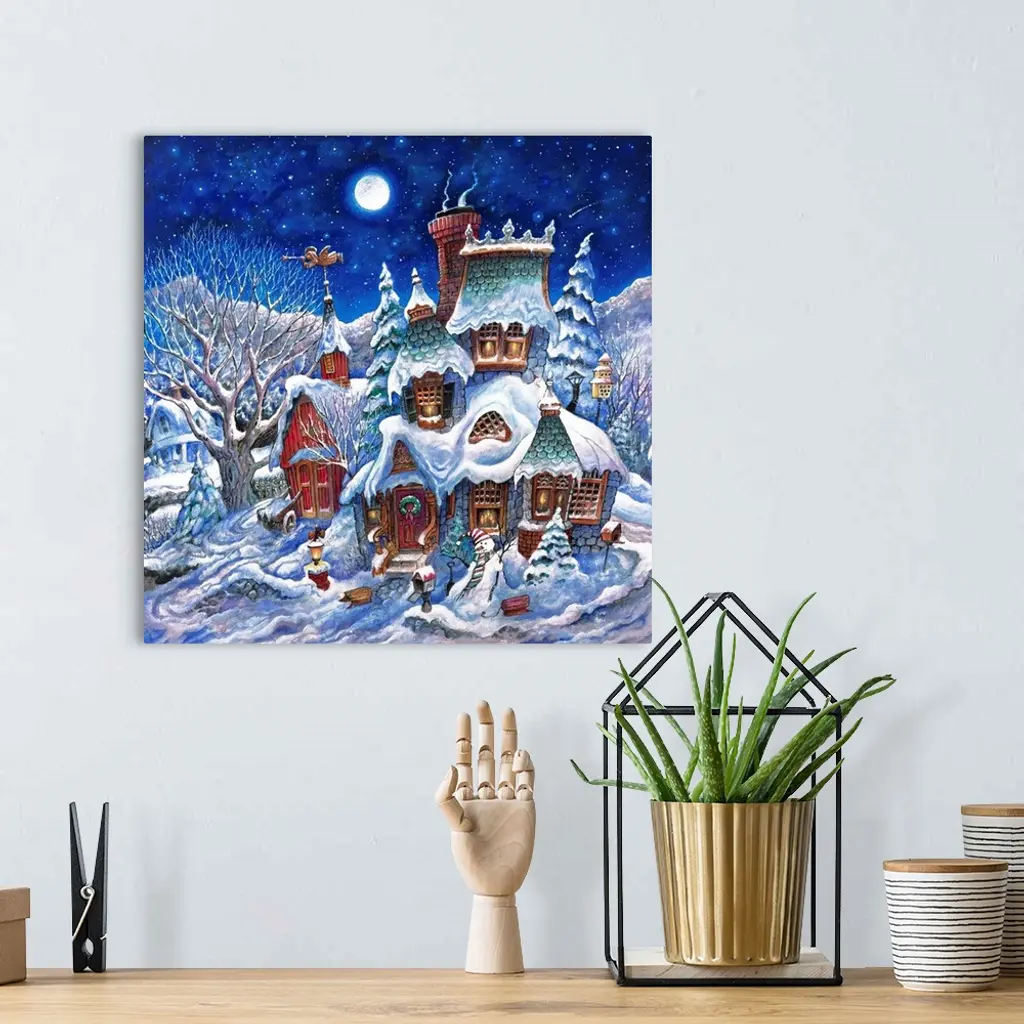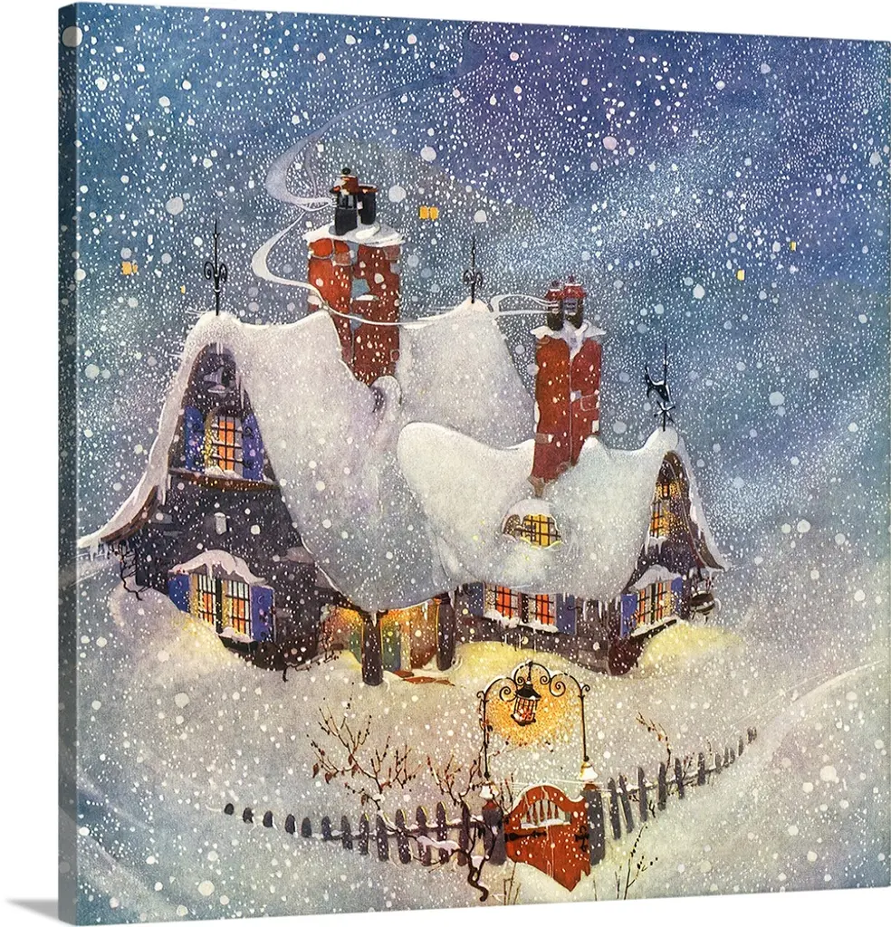 Tipsy Victorian house covered in snow. Snowman in front yard.