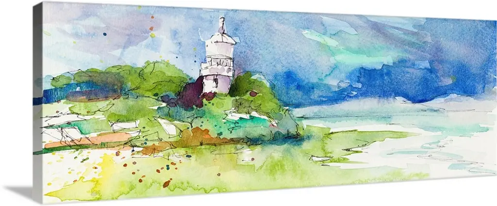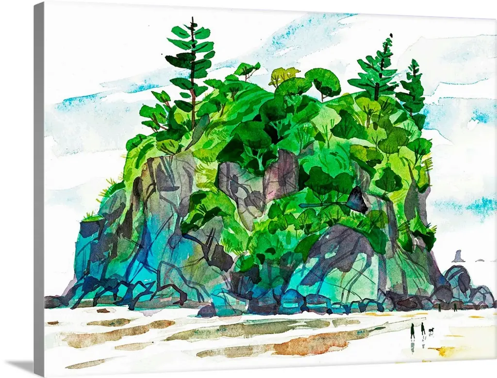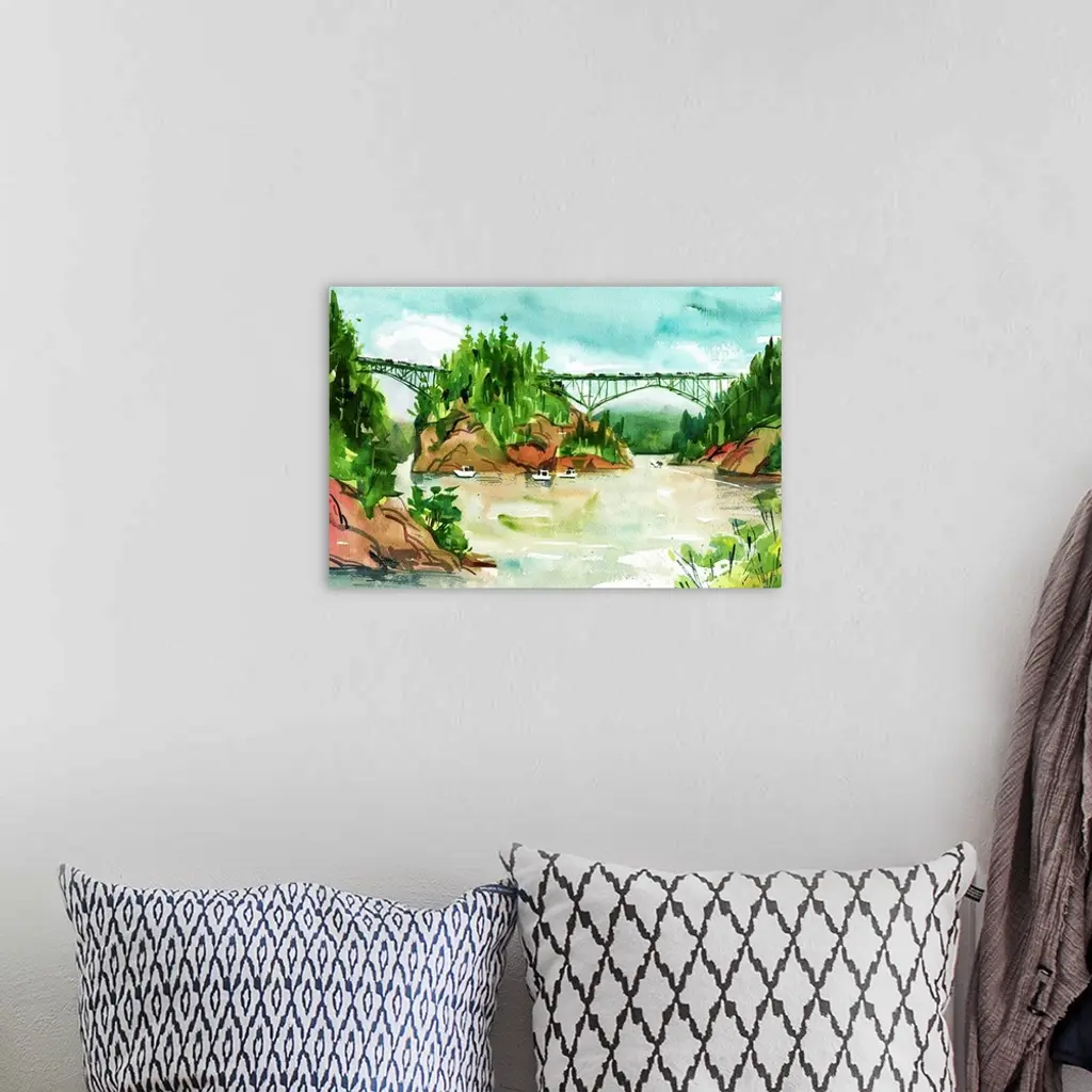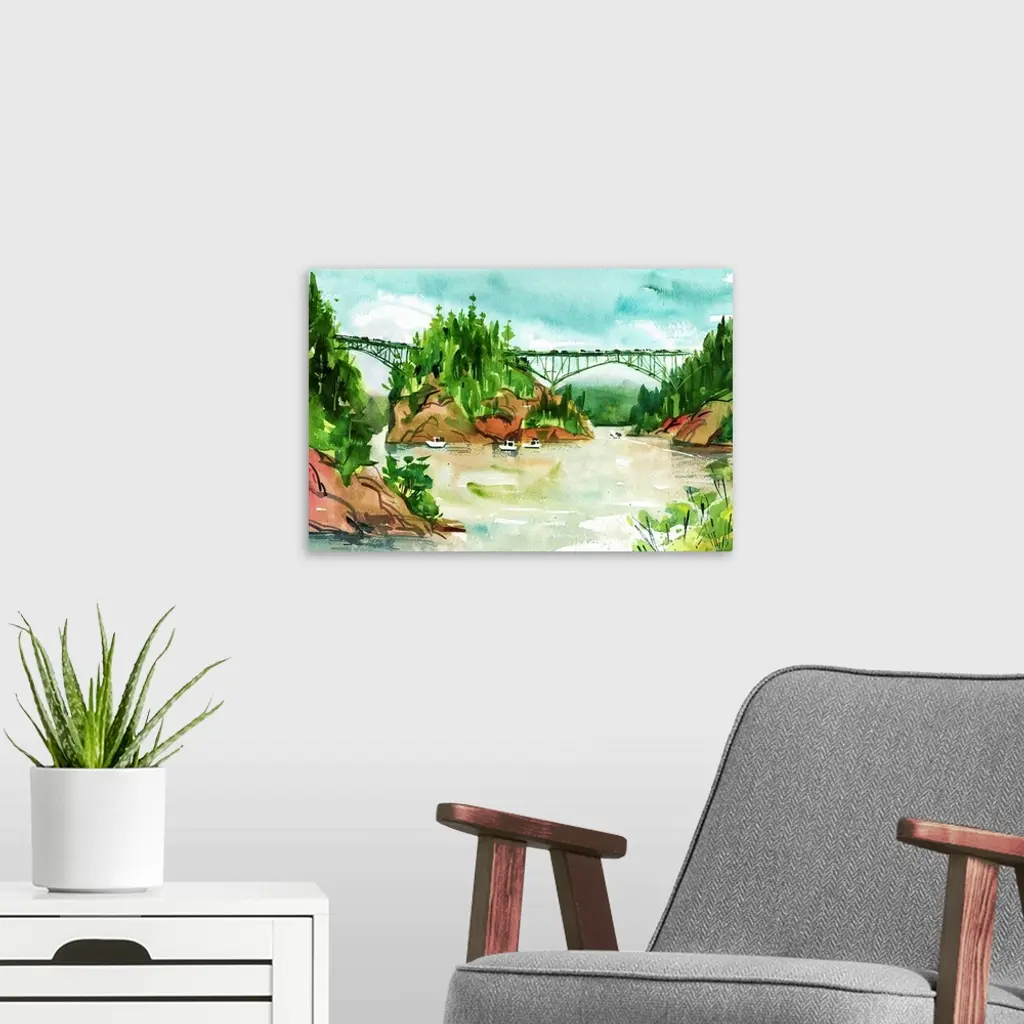 Watercolor interpretation of the famous bridge over Deception Pass in Washington State, crossing the Puget Sound to Whidbey Island. Little fishing boats lend a sense of scale to the islands and structures. You can see a hint of cars passing over.