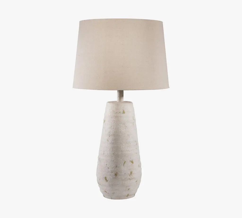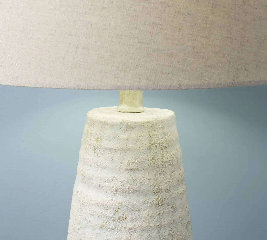 Equal parts organic and modern, this table lamp brings versatile style to your space. Decker’s composite base offers the rough-hewn texture of hand-sculpted clay, its subtle ridges lending dimension to the white finish. Topped with a crisp ivory linen shade for tonal beauty, the fixture provides the perfect match for a relaxed living area or bedroom.