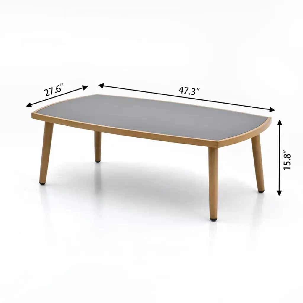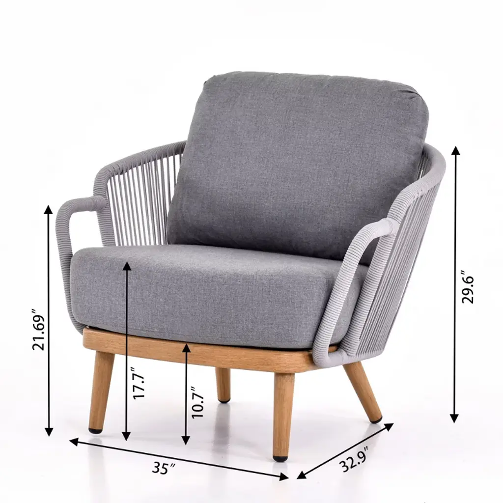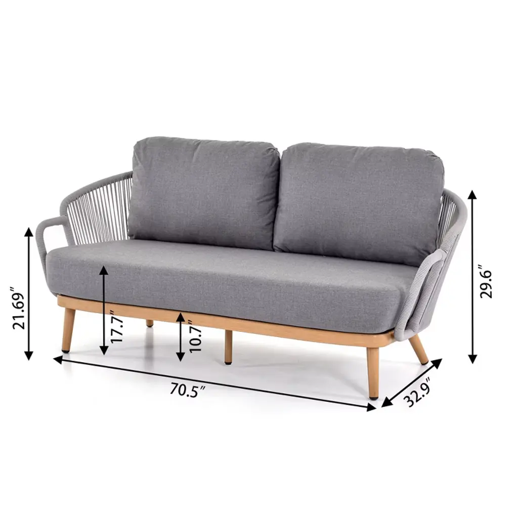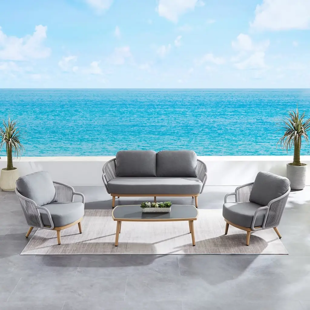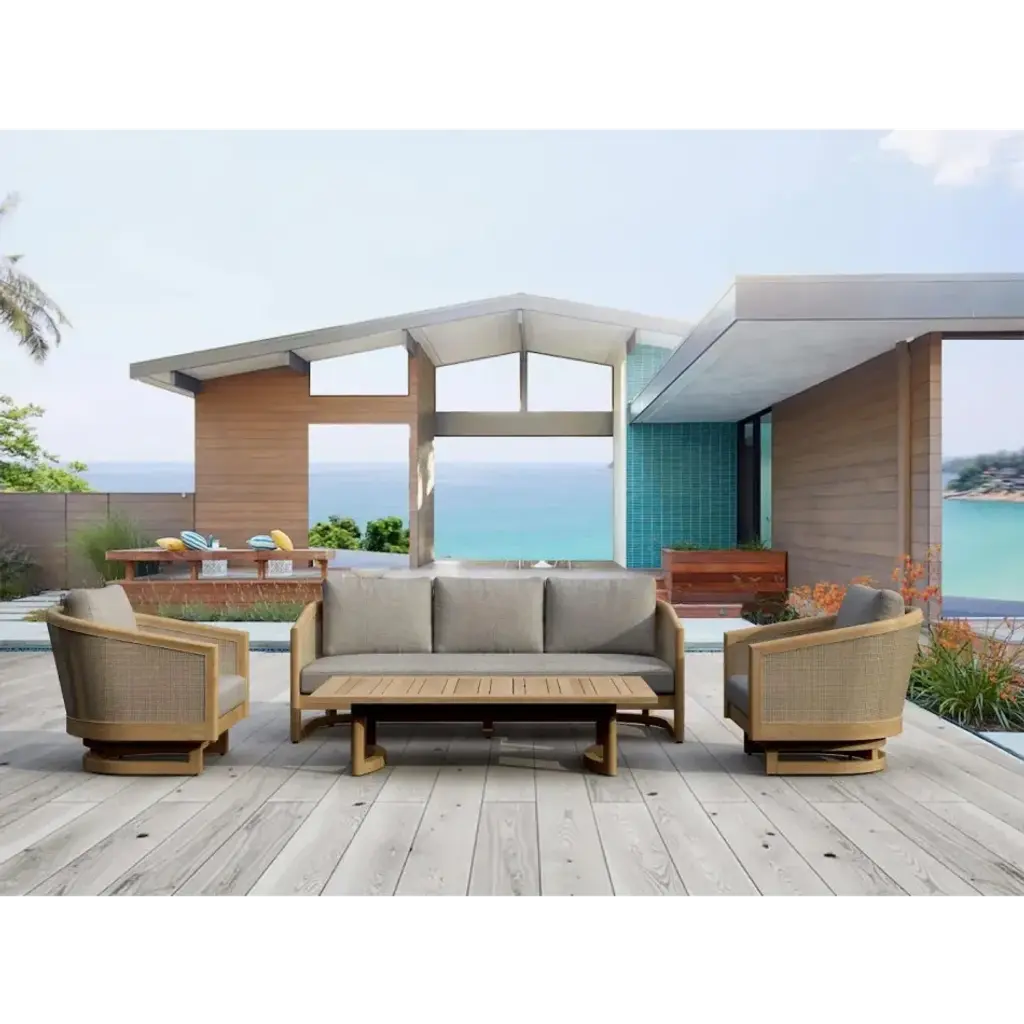 "About This Product Embrace the ultimate outdoor living experience and unwind with your loved ones! The stunning Decksplore 4-piece chat set from the collection mimics the elegance of teak, yet crafted from lightweight, rust-proof aluminum. It features a spacious couch and 2 cozy lounge chairs, all with weather-resistant cushions, ensuring durability and comfort whatever the weather. What's Included? Loveseat 2 - Lounge Coffee table"