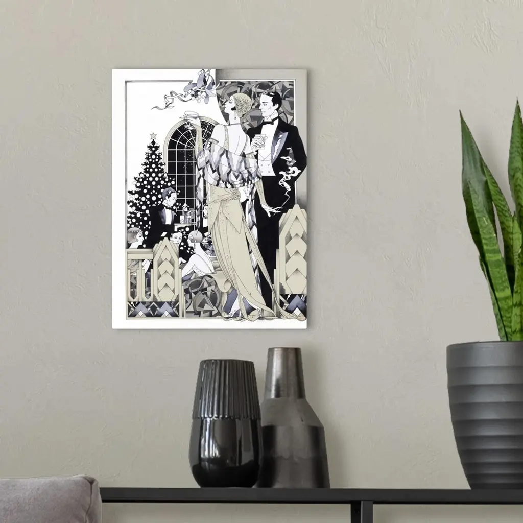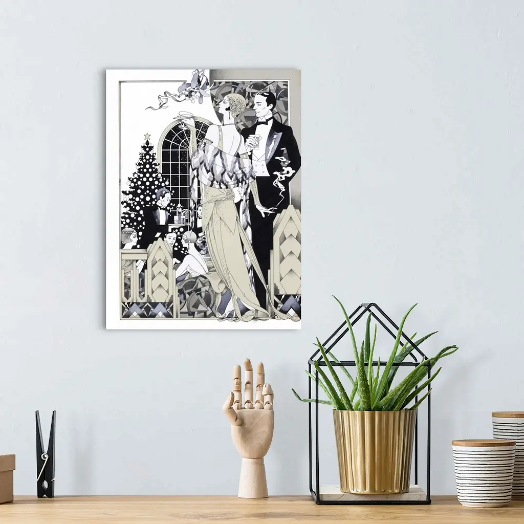 Art deco style illustration of a couple in formal wear looking at a Christmas dinner scene.