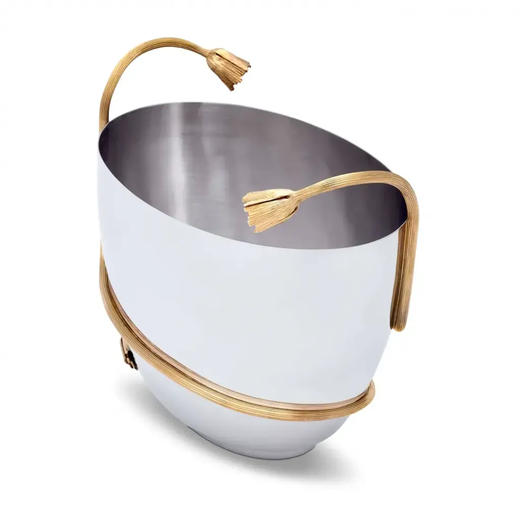 Recalling the grand serving traditions of the early 20th century, the Deco Leaves collection is a richly textured marriage of handcrafted stainless steel and 24K gold-plated accents. Prior to founding L’Objet in 2004, Israeli-born Elad Yifrach was a successful designer in Beverly Hills. He was creating beautiful interiors, but he was frustrated by the limited options available in home accessories, so he set out to create something better. L’Objet’s collections are diverse, but they are almost always inspired by nature and architecture. Many of his exquisite serving pieces rest in a base of hand-crafted gold foliage, other pieces feature intricate design and beadwork, and some of the most striking objects actually look like miniature buildings. And despite the lux feel, much of the line is practical with just a touch of whimsy.
