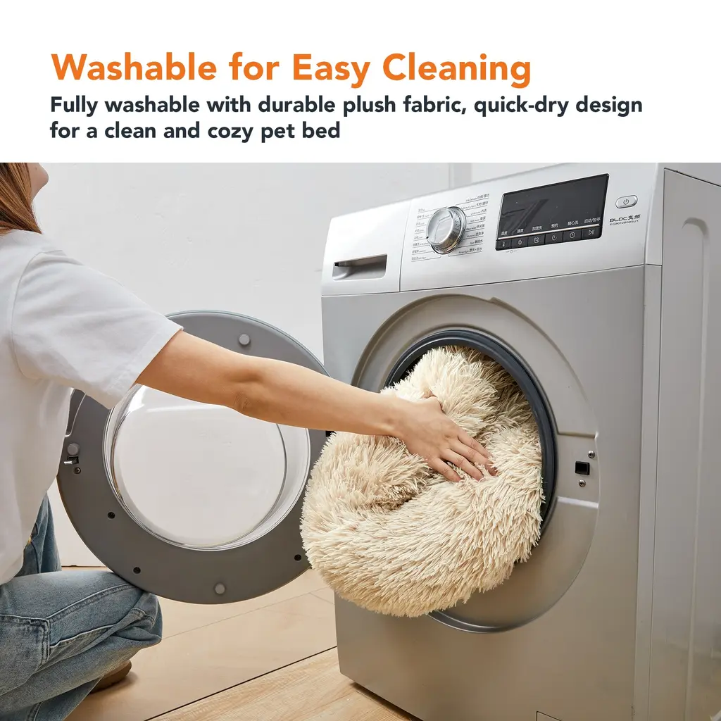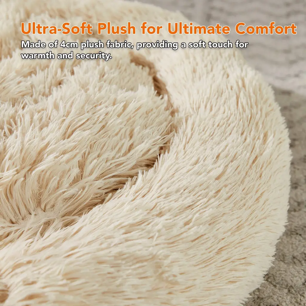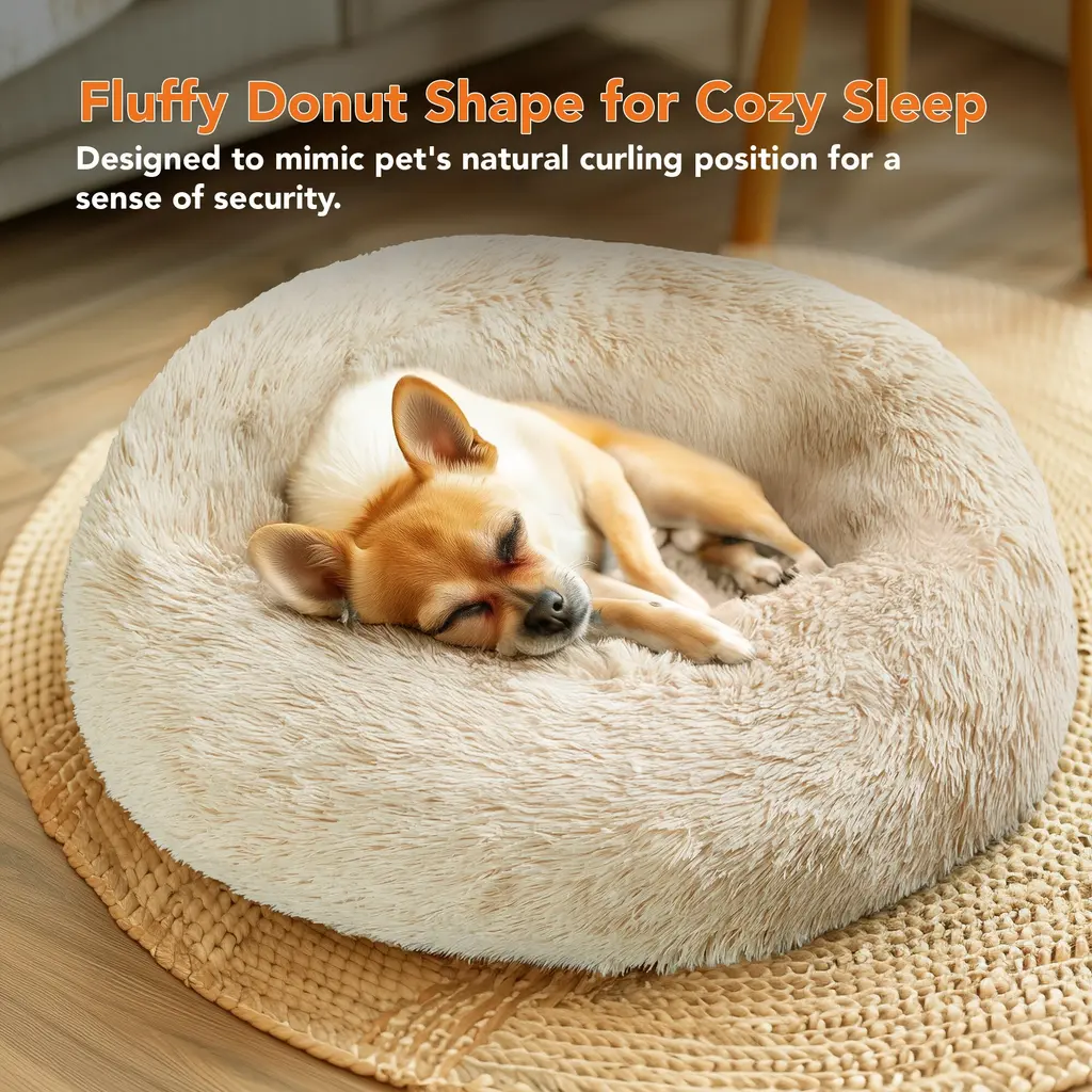 Give your pet the cozy comfort they deserve.Crafted with ultra-soft 1.5 Inch plush fabric and generously filled for 8-inch thick orthopedic support, this donut-shaped Deconovo pet bed creates a calming retreat that your furry friend will love.Perfect for pets who love to curl up, this bed helps relieve joint pressure while surrounding them in warmth and softness. Whether it's nap time or bedtime, this bed provides a comforting haven.What You’ll LoveCertified Safe: OEKO-TEX STANDARD 100 certified—ensuring your pet rests on non-toxic, eco-conscious materials.Supports Deep Sleep: Donut shape cradles your pet in a hug-like comfort for better rest.Stays in Place: A non-slip bottom keeps it secure on tile, hardwood, or carpet.Hassle-Free Cleaning: Toss the entire bed into the washing machine for easy upkeep.Sized to Fit: Available in five sizes to accommodate pets up to 75 lbs, from small cats to medium and large dogs.Color Options: Stylish neutrals that complement any room—Pink, Cream, Dark Grey, Light Khaki, and Light Grey.Size GuideStyle and sustainability, right at home. This is more than a pet bed—it's Deconovo comfort with a conscienceCare Instructions: