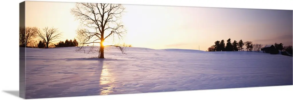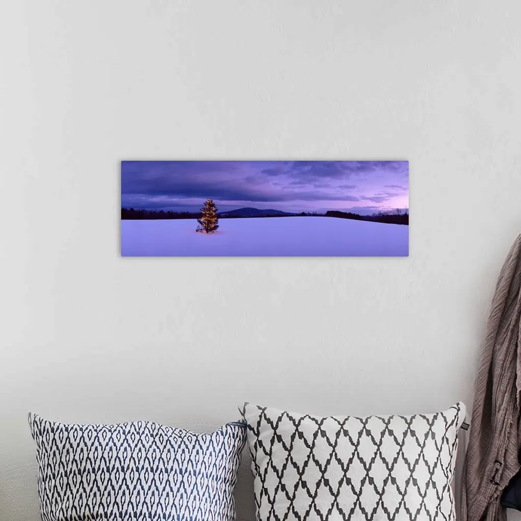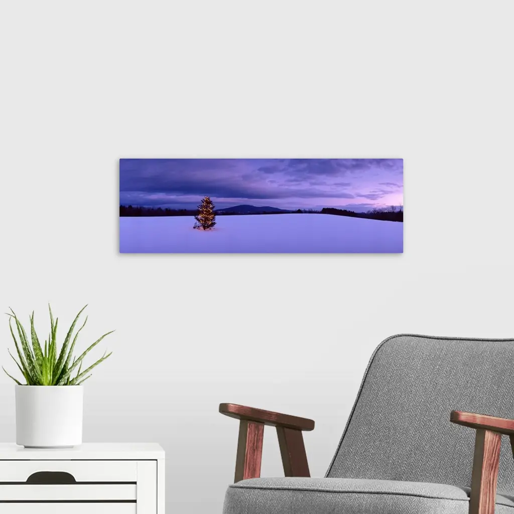 Decorated Christmas Tree In A Snow Covered Landscape, New London, New Hampshire