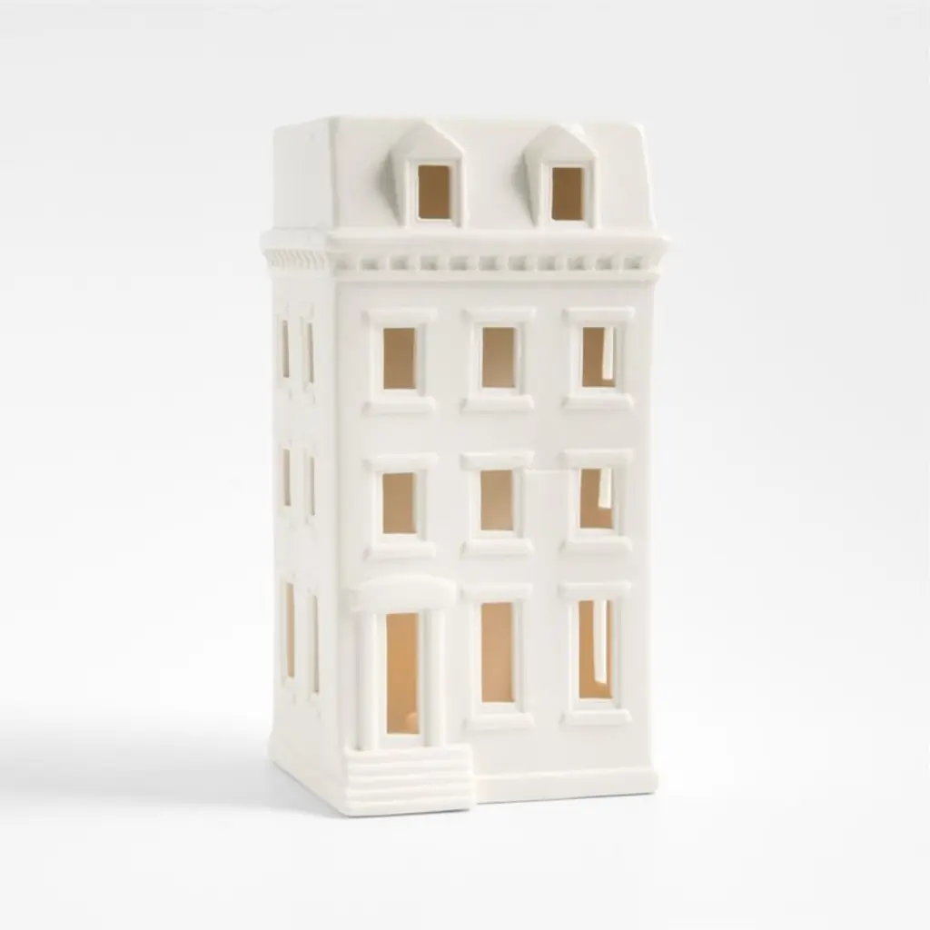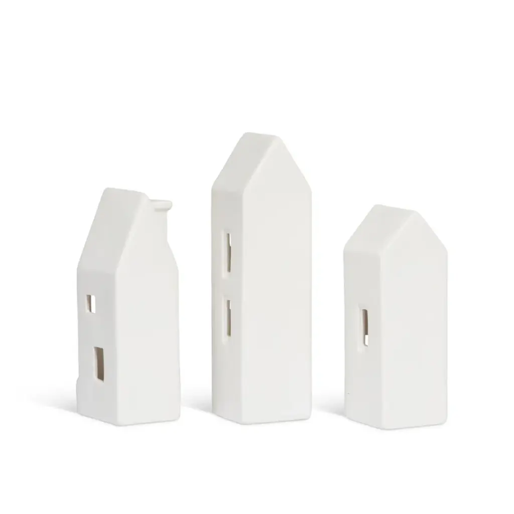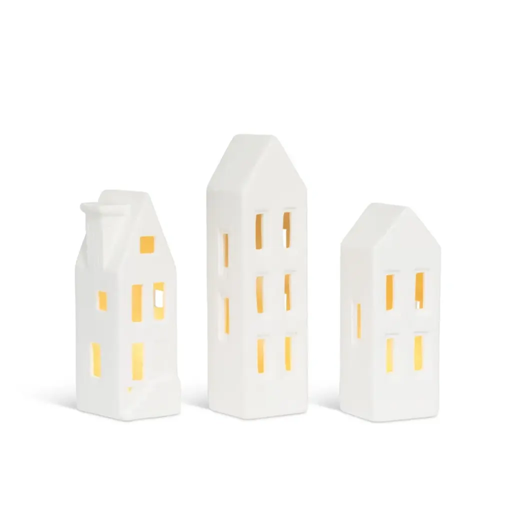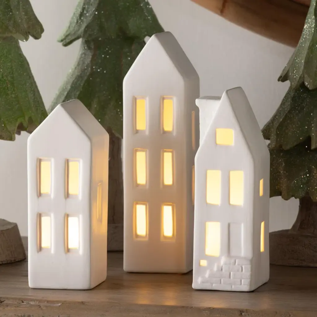 Inspired by the quiet beauty of winter by the sea or lakefront, this set of three ceramic LED lighted townhouses brings a calming elegance to your holiday décor. With clean lines and a soft, matte finish, these charming houses cast a warm, inviting glow, creating a peaceful ambiance that feels like a cozy retreat from the holiday rush. Whether displayed on a mantel, tabletop or as part of a festive village scene, these minimalist townhouses offer effortless charm.