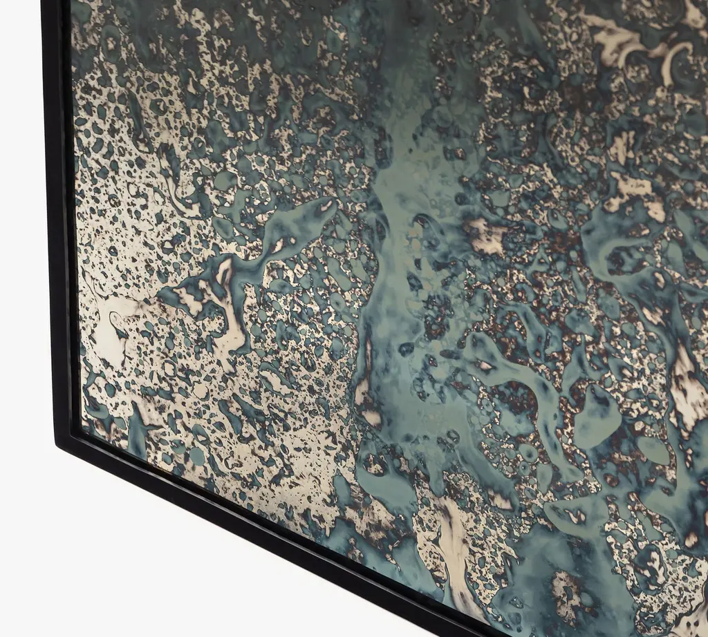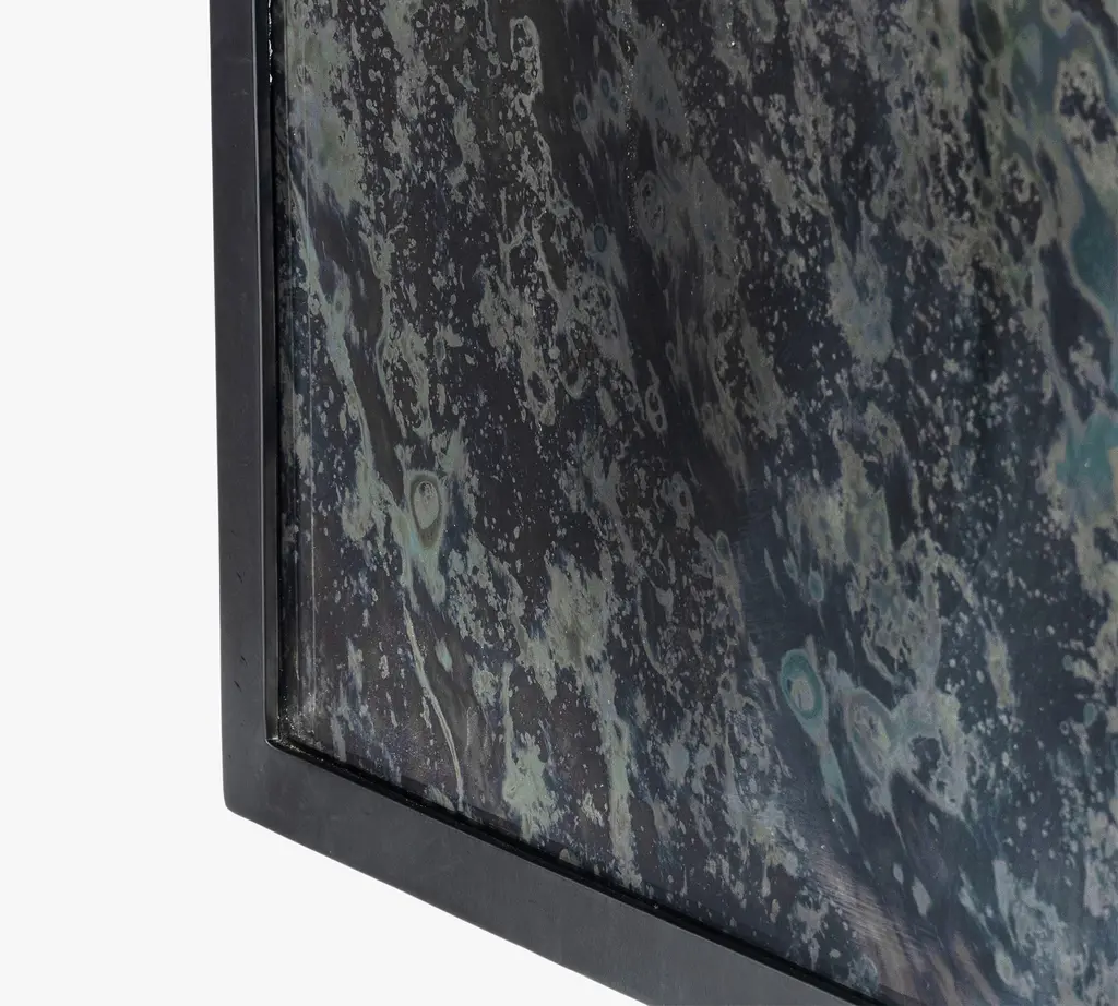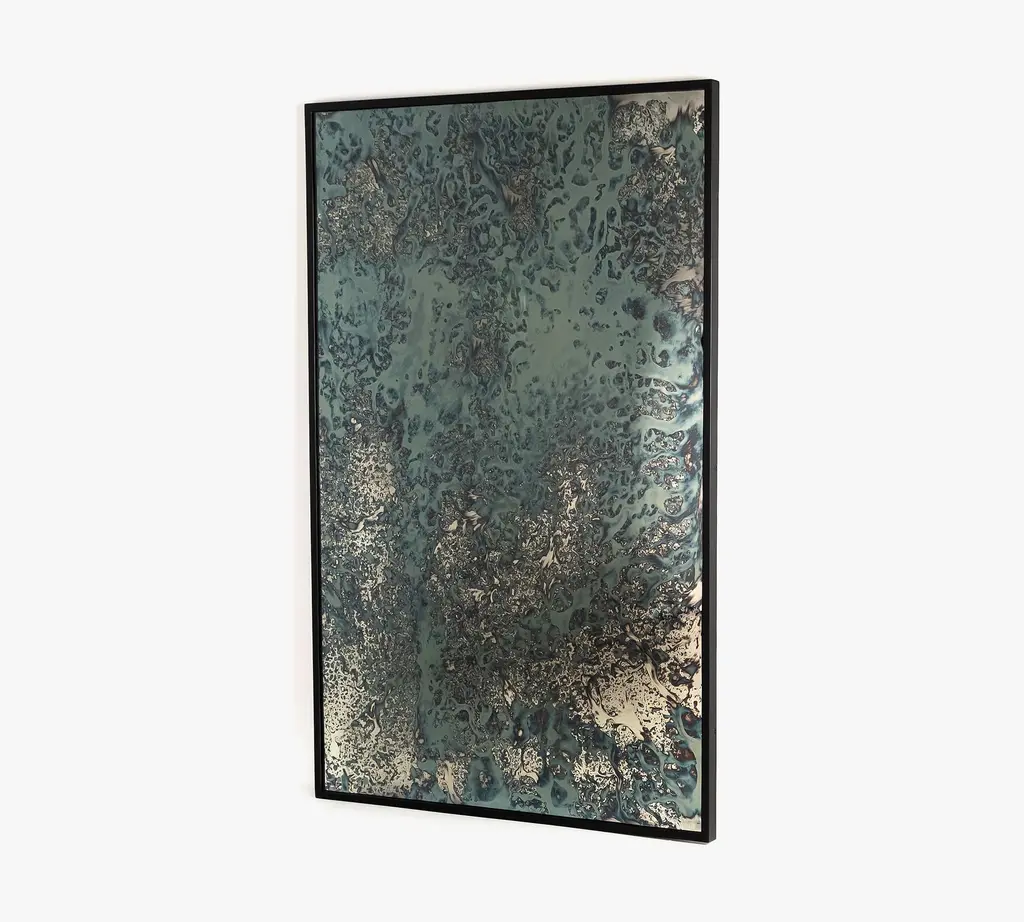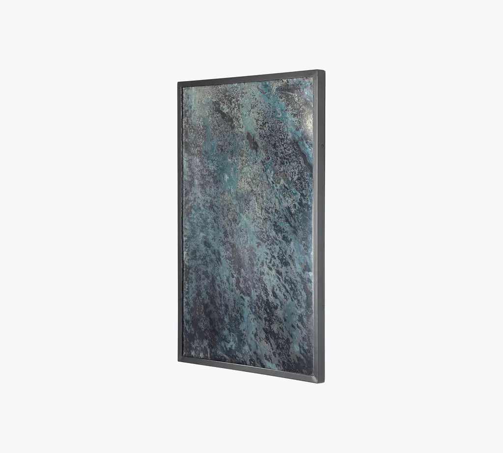 Hand painted for one-of-a-kind character, this iron-framed mirror is a work of art. It's an intriguing composition with subtle reflection rendered in acid-washed blue hues.