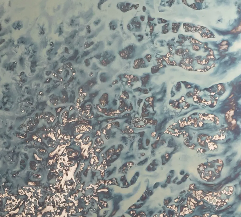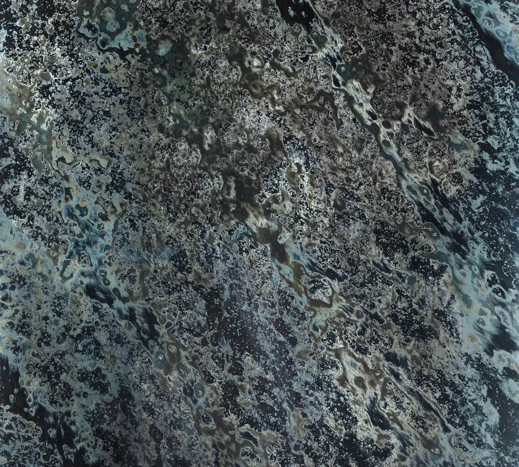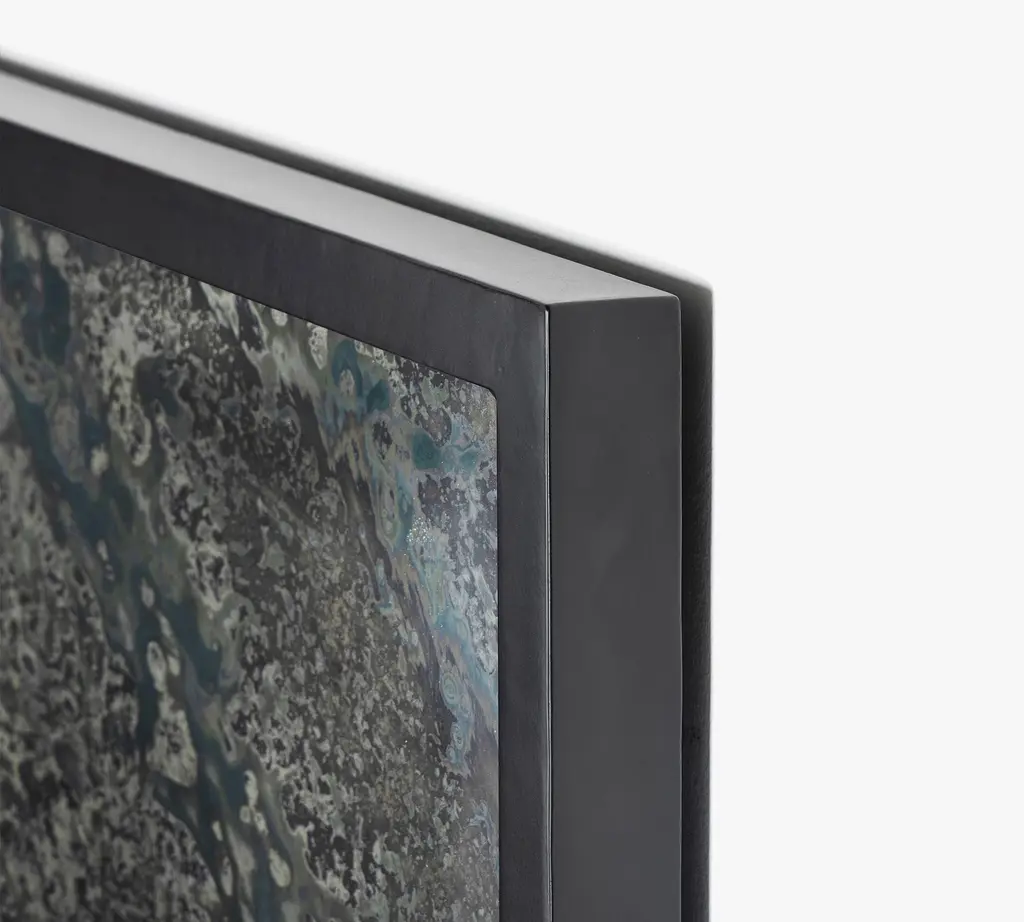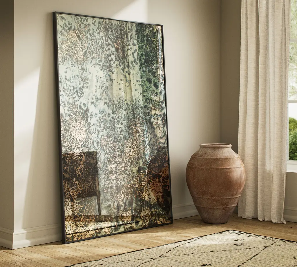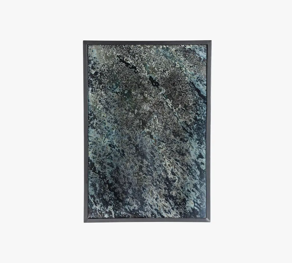 Hand painted for one-of-a-kind character, this iron-framed mirror is a work of art. It's an intriguing composition with subtle reflection rendered in acid-washed blue hues.