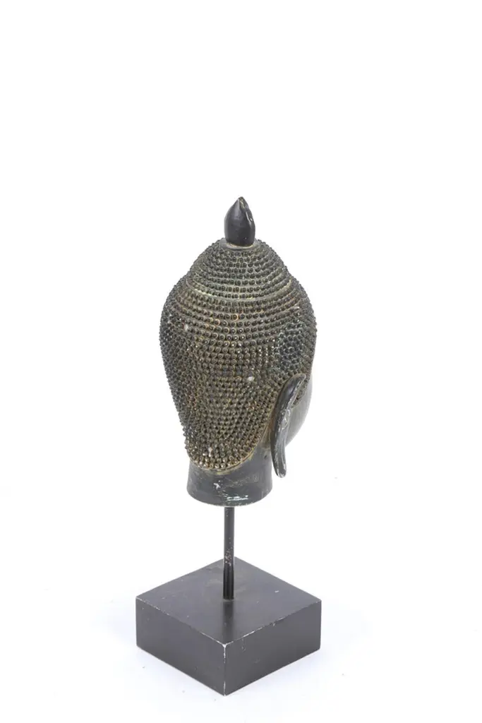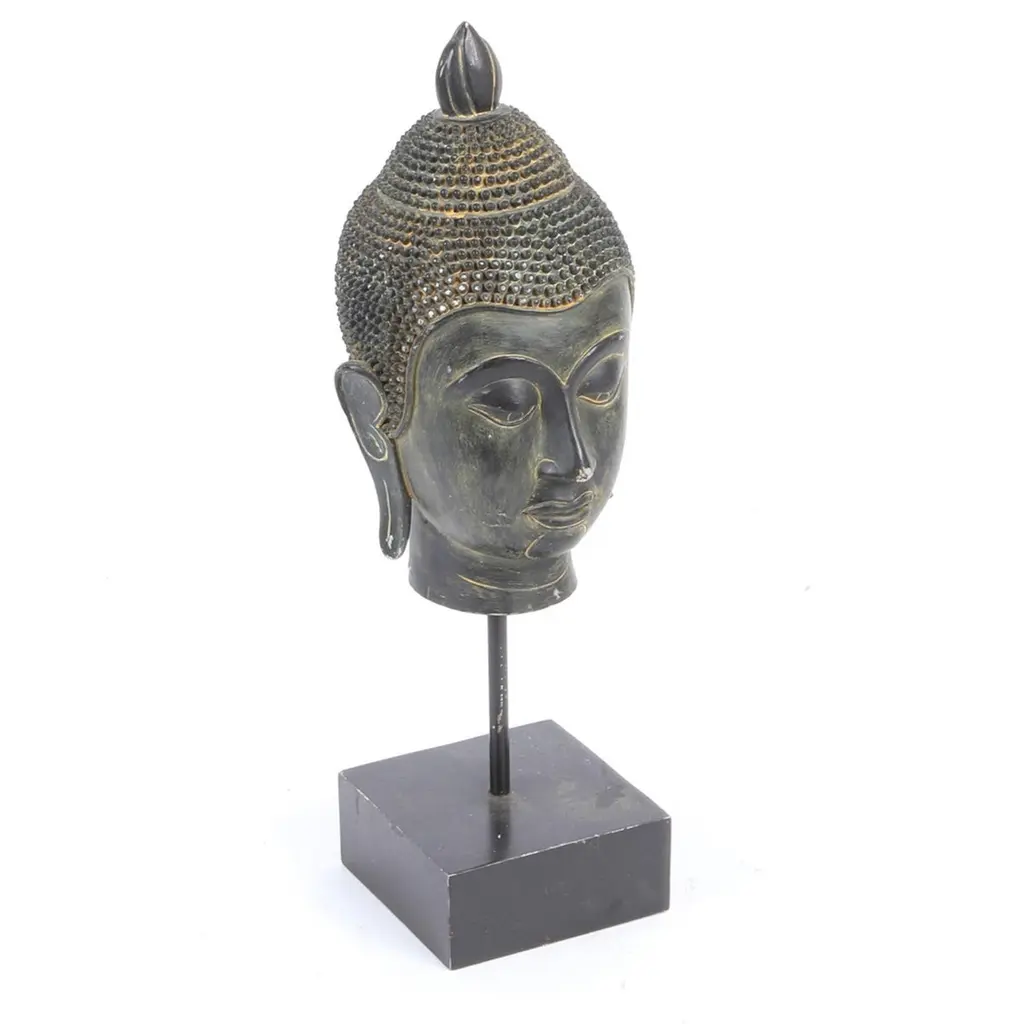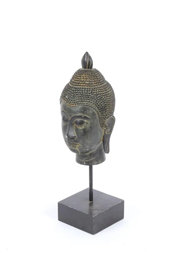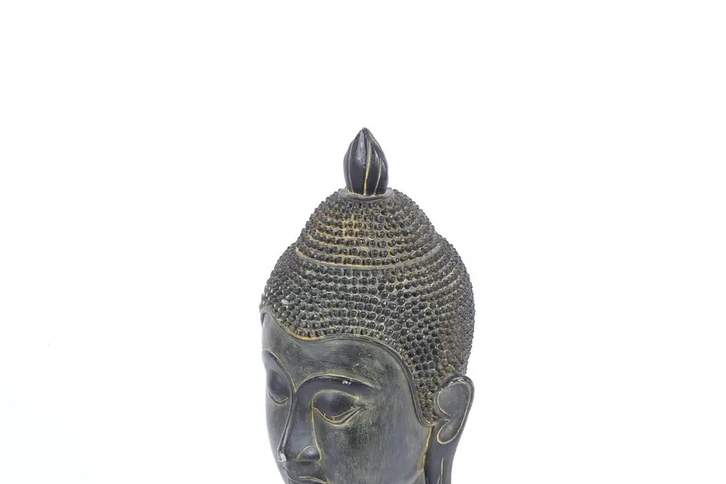 The antique Buddha head is an icon of confidence, awareness, knowledge, compassion and concentrated meditative practices. Every faculty of the Buddha's head symbolizes a hidden meaning, philosophy, history, occult, and above all how to individually and collectively be great, noble and a kind human being.If a decorative Buddha figure is placed in a car, it should face forward. In the garden, the statue should face the home to bring abundance and prosperity. Indoors, keep the statue facing into the room unless it is facing the main entrance from another angle, to block negative energy and greet visitors.This head will add character and interest to any interior/room it’s placed in and will only improve with age.34cm tall.