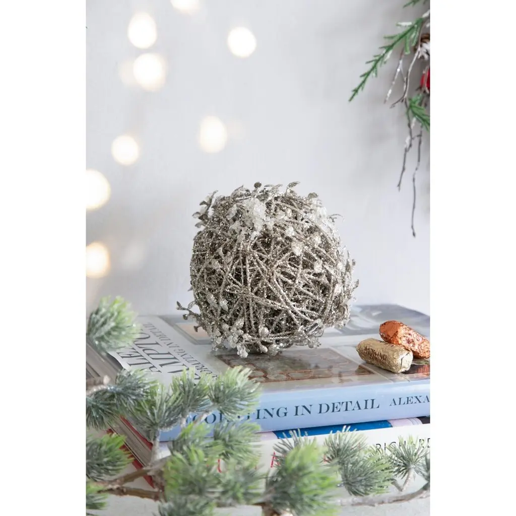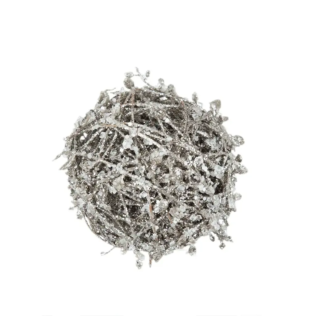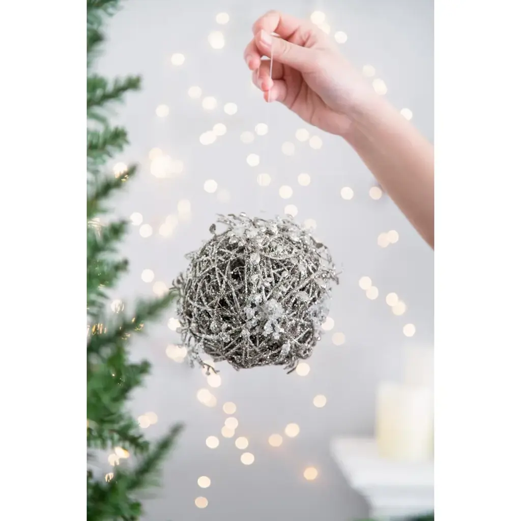 Product FeaturesTake a more natural-looking approach to decorating your Christmas tree with an iced leaf and twig ball.This hanging ornament boasts a rich silver color, making for a great contrast.This ornament also makes for a great gift or stocking stuffer.The Features: Glittered accentsProduct Details: 50% Plastic,30% Wire,20% AngelvineSpecificationMeasurement:4.5x4.5x4.5(Inches)Weight:0.3lbs/eachDescriptionThe DesignTake a more natural-looking approach to decorating your Christmas tree with an iced leaf and twig ball. This hanging ornament boasts a rich silver color, making for a great contrast. This ornament also makes for a great gift or stocking stuffer.