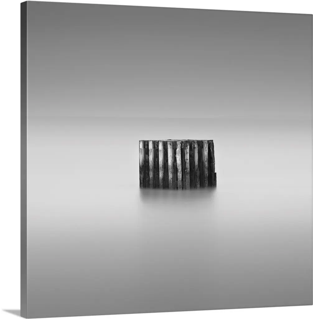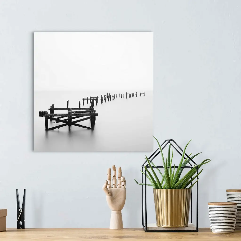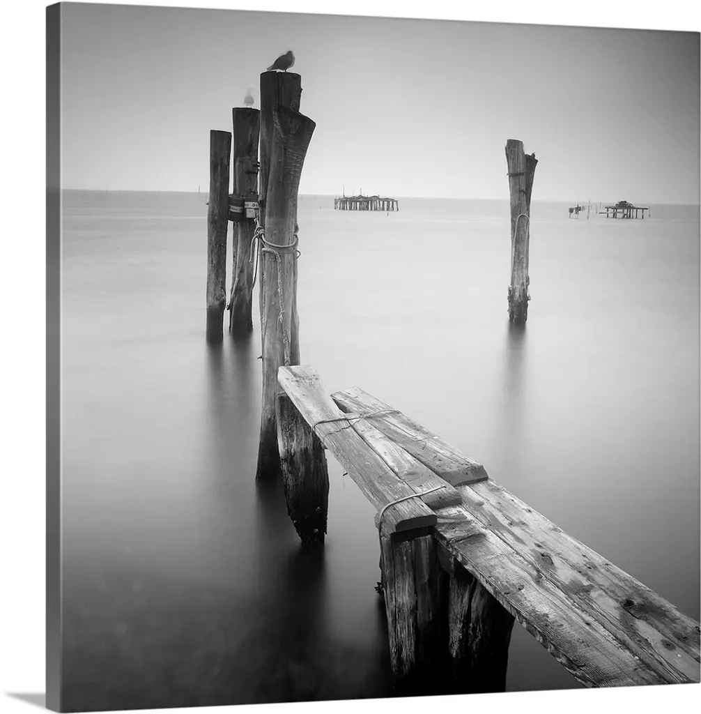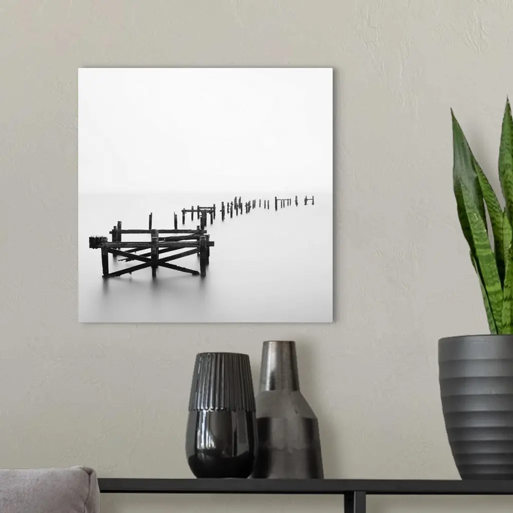 Large photograph focuses on a deteriorating dock sitting alone in a wasteland of fog.