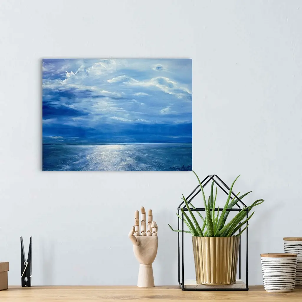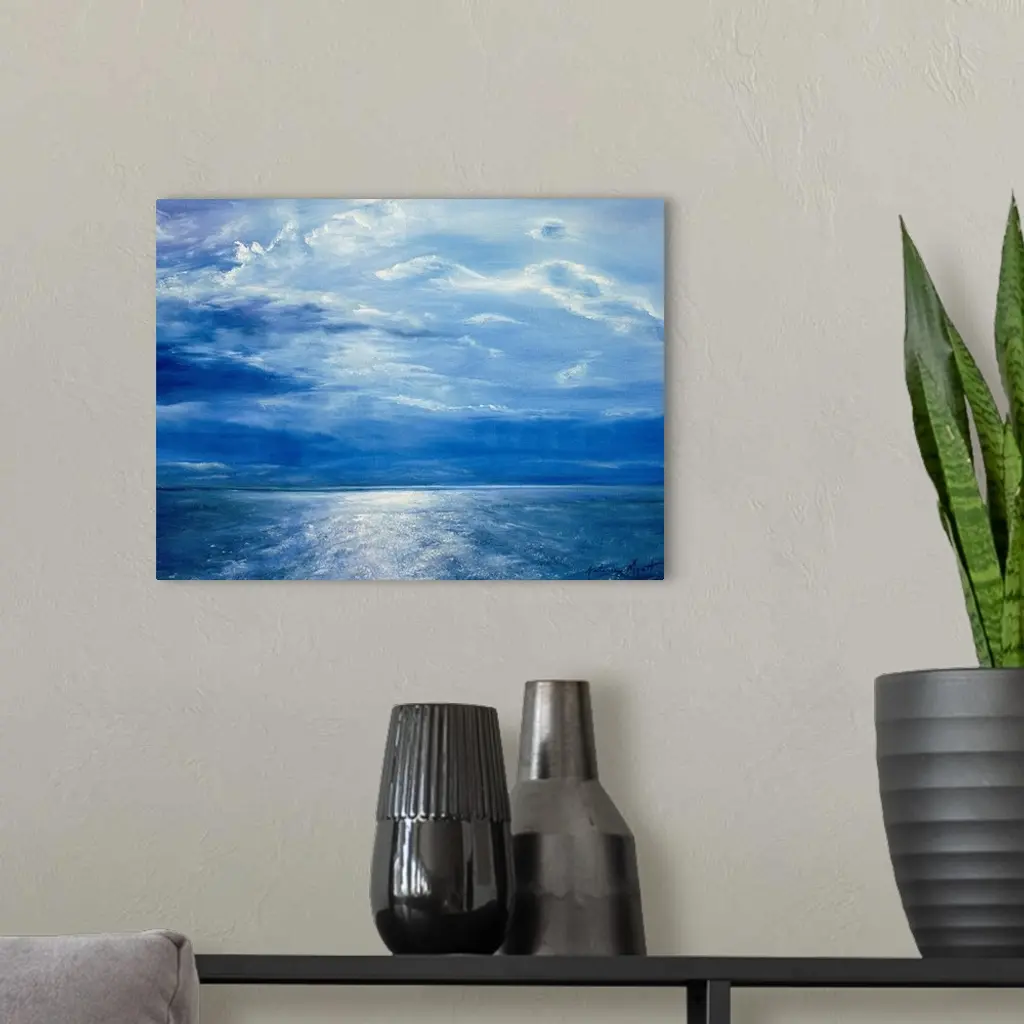 Big monochromatic contemporary art shows the glow of moonlight breaking through clouds and reflecting over a vast ocean space.