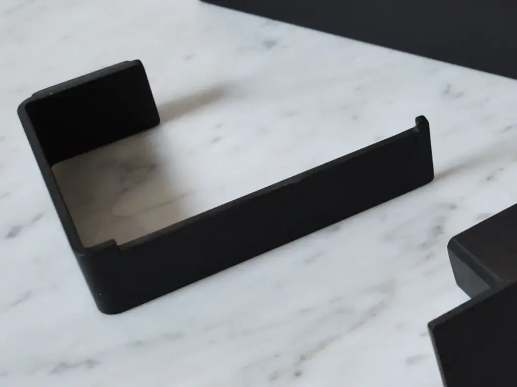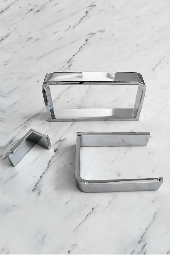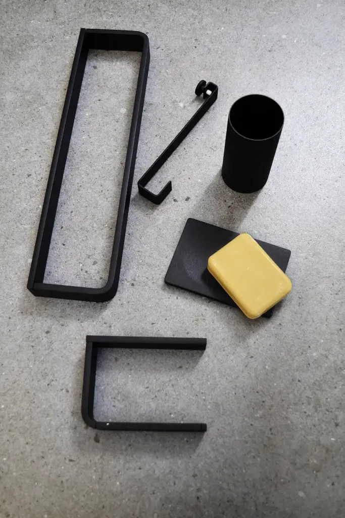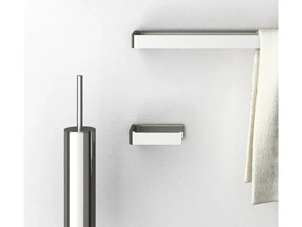 Essential lines with material impact. This collection is identified by its simple, yet at the same time bold, form.It consists of essential pieces such as 30, 45 and 60 cm wide towel rails, double and single hooks, roll holder, liquid soap dispenser, countertop soap dish, towel rail, toilet brush holder, shelf and shelf with towel rail.