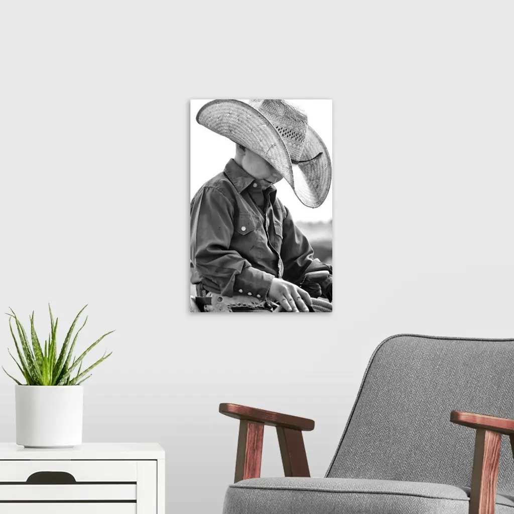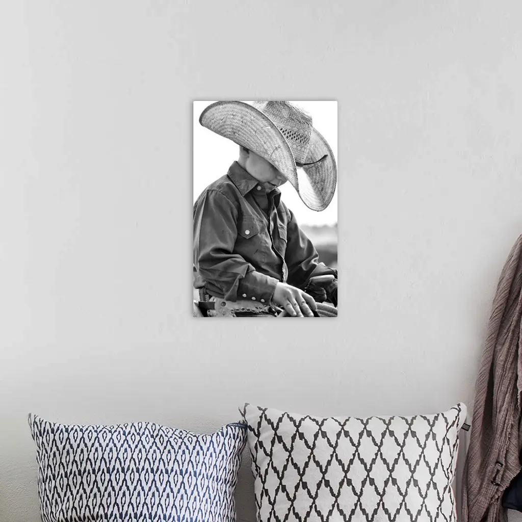 Young cowboy looking pensive in the saddle
