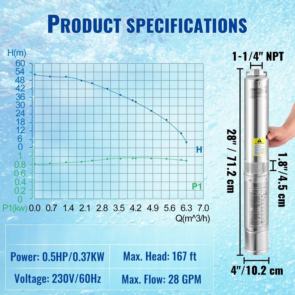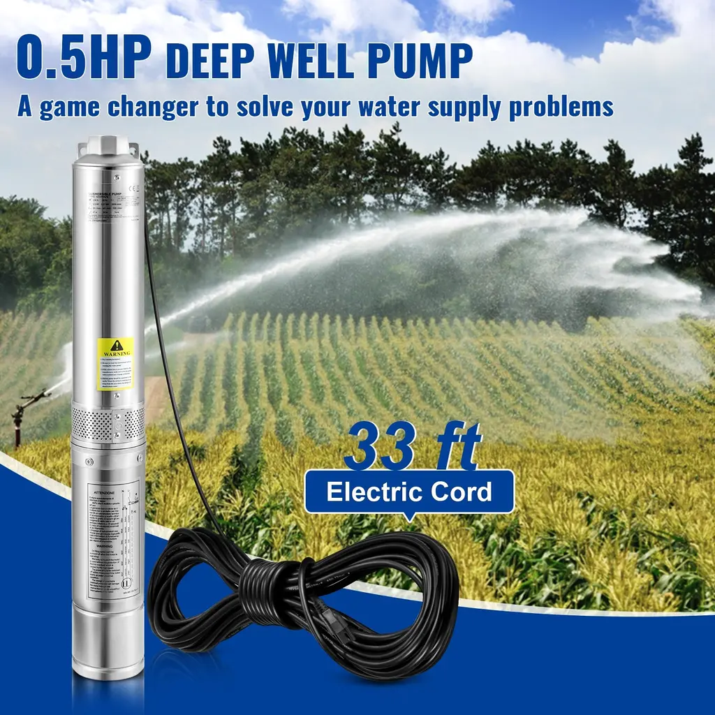 Enhanced Pump Flow & Head: Power: 2/1/1.5/0.5HP, 230/115V; Diameter: 4" (for 4" or bigger well casing); Discharge: 1-1/4" NPT. This deep well submersible pump is designed with 12/6/8/5-stage thermoplastic impellers, providing 37/28GPM max flow and 427/276/207 ft max head. It comes with an external control box and a 33 ft electric cord, making life without modern plumbing a lot easier. Pump out your worries with ease and relax. No challenge is too big for you. Upgraded Stainless Steel: The whole frame of our deep well pump is unlike anything on the market. It is made of stainless steel, including the outlet and connecting components. You don't have to worry about it becoming rusted or corroded after being underwater for a long time. With ETL certification and IP68 waterproof grade, the pump can be used for 8-10 years. Stop wasting time! The perfect choice is in front of you! Reliable Copper Motor: Are you tired of previous submersible well pumps failing you? Are you ready for consistent satisfaction and quality? The powerful copper motor and high-precision rotor promise long-term stable running. The motor features built-in overload protection, allowing it to automatically stop when stuck or during abnormal situations to prevent burning. NOTICE: DO NOT use it without water or at a low water level to avoid idle running. Trouble-free Check Valve & Filter: This well pump has a built-in check valve to prevent back-flow (an additional check valve is highly recommended). The stainless steel filtration mesh is designed to filter impurities. You can add a layer of gauze in front of the filtration inlet for a new drilled well that may contain excessive granular sediment. Keep impurities out without the headache. Use It Anywhere: Whether you want to solve water supply problems for industry, farmland, or home, this deep water well pump is the one you can trust. It works excellently as a garden water source and sprinkler for the kids. You can use the pump for extracting water from deep wells, reservoirs, canals, rivers, and other water-lifting works. Note: We use the standard US plug for the 230V deep well pump, the same as the 115V plug. However, the 230V is industrial power with many kinds of plugs. You can cut off the plug for installation if the plug does not match. This product and the power cord are tested according to the 230V standard, fully meeting the 230V use environment. Package Content 1 x Deep Well Submersible Pump 1 x External Control Box with US Plug 1 x 33 ft Electric Cord