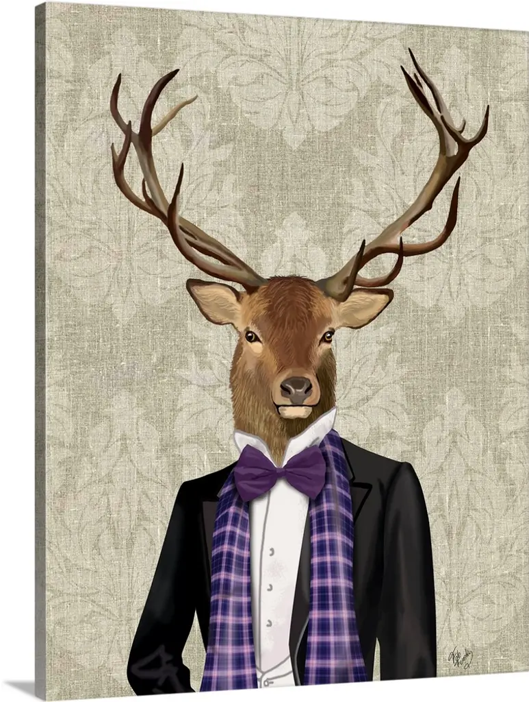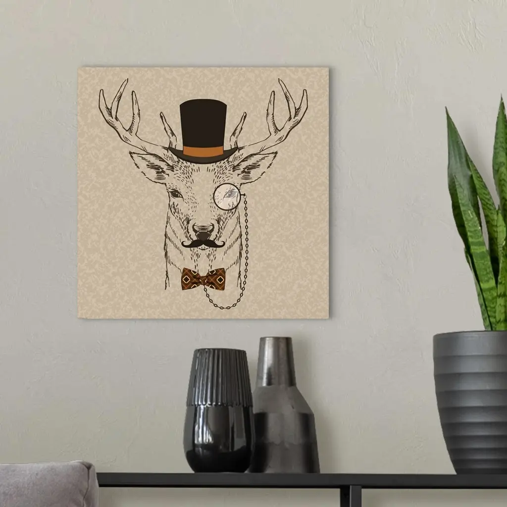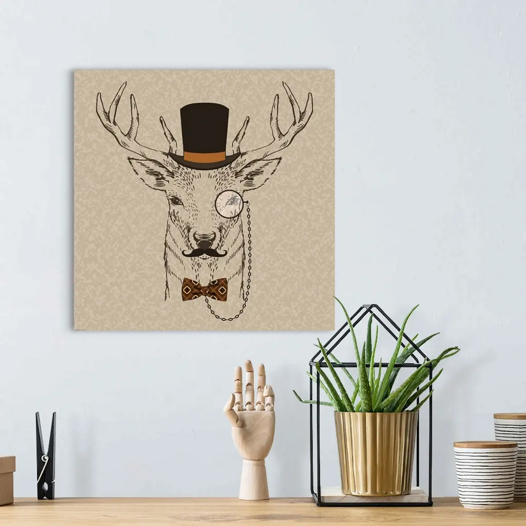 Illustration of a deer head with a mustache, top hat and monocle.