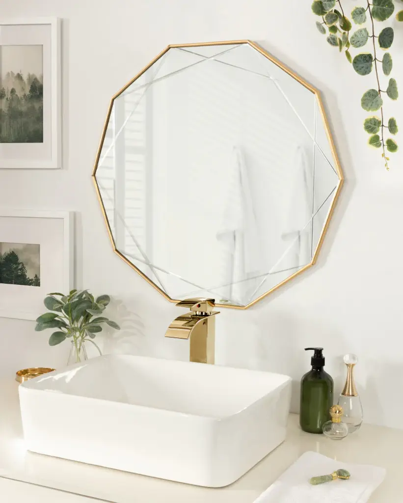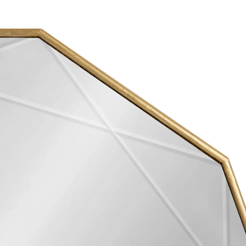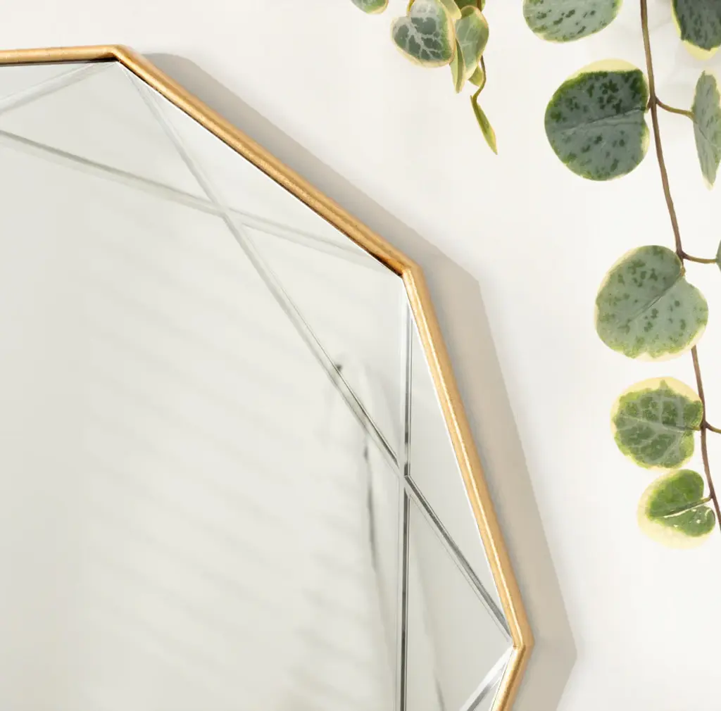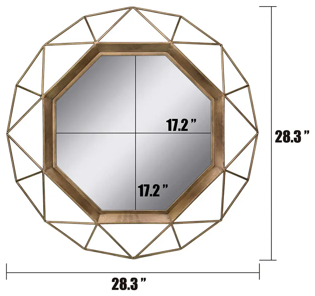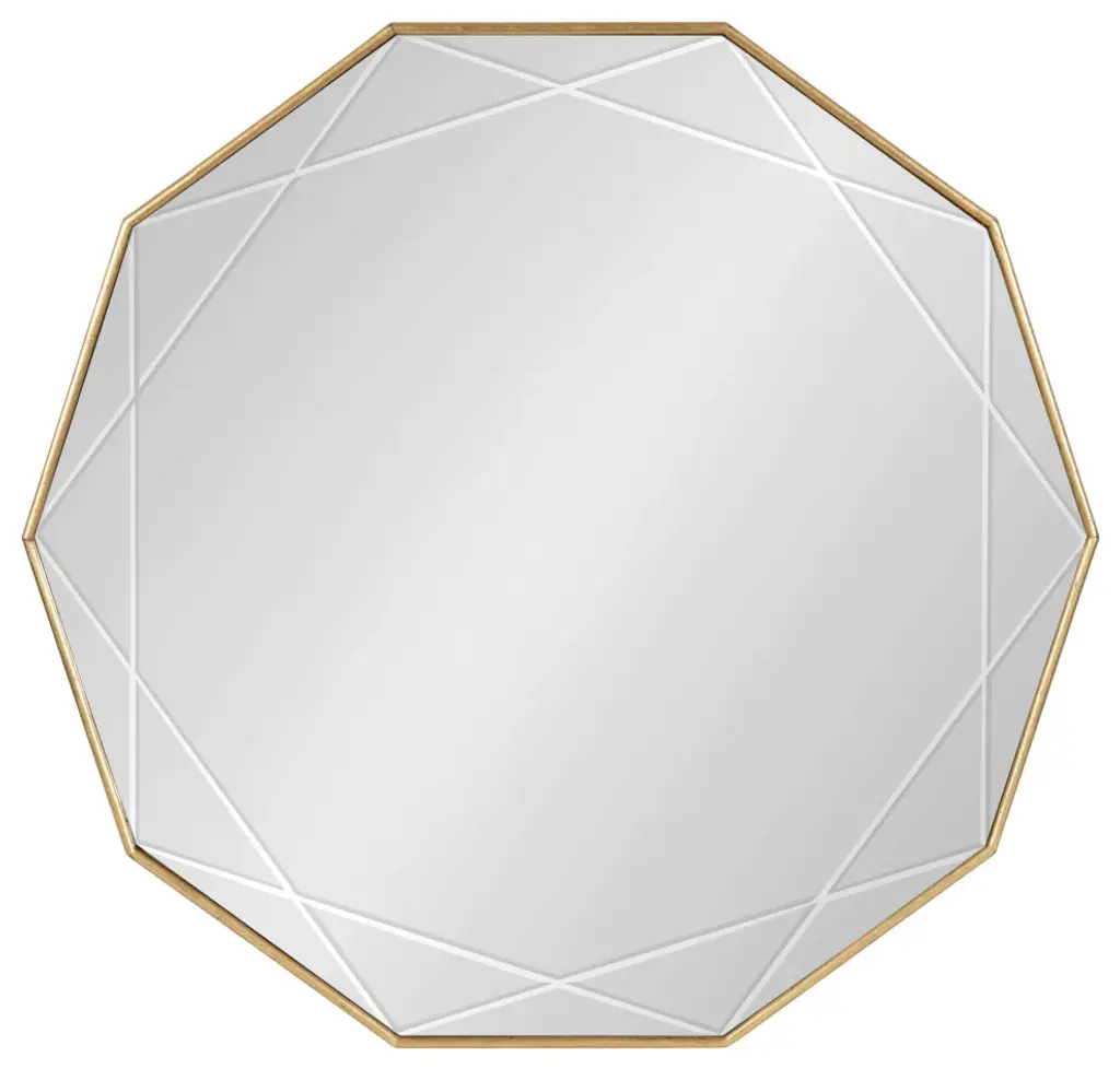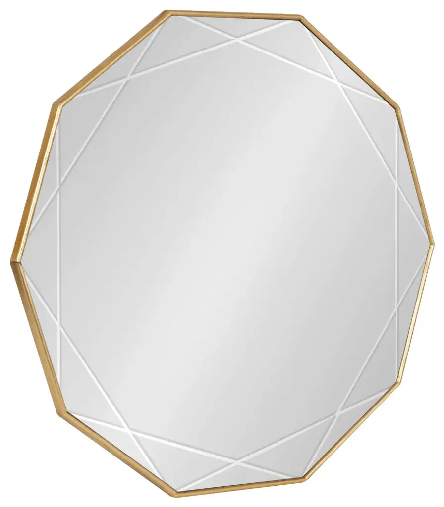 Bring a dynamic and glamorous piece of home decor to your favorite space with the Deka wall mirror. This decadent accent mirror captures your attention with its geometric frame and draws you in with the unique deep-set grooves within the sleek glass surface. The starburst-shaped frame also features a dazzling and warm gold finish on the frame, creating a more welcoming environment out of your favorite living space. The overall dimensions of this modern accent mirror are 26 inches wide by 26 inches tall, making it an outstanding focal point to tie the room together. Feature the Deka mirror over your mantle, above a console, or paired with your dresser. Its large surface area also makes the Deka mirror a fantastic bathroom mirror above your vanity! Regardless of where you hang this mirror, it is a fantastic showcase of your modern glam taste while expanding the room''s dimension with its reflective and vibrant nature. Use the metal D-ring hangers attached to the back of the frame for quick and easy installation in a matter of minutes. • MODERN DESIGN: This stunning design of the Deka wall mirror includes a geometric nonagon frame and inset grooves engraved within the glass that connect to each point of the frame• GLAMOROUS FINISH: The bold style and comforting warmth of the Deka''s gold finish allow it to set the tone of your space, making it feel more welcoming • LARGE SIZE: The Deka captivates you with its commanding presence, measuring 26 inches wide by 26 inches tall to create an eye-catching focal point in any space• VERSATILE: The large size of the Deka mirror make it the perfect room decor, opening your space with its vibrant reflective surface. It''s also a fantastic bathroom mirror to hang above your vanity • EASY TO HANG: Use the metal D-ring hangers attached to the back of the Deka wall mirror for quick and easy wall installation in a matter of minutes