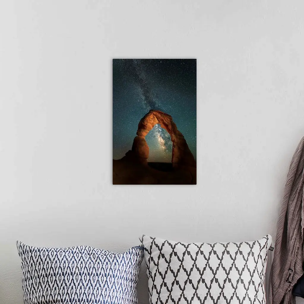 The Milky Way Galaxy in the night sky seen through Delicate Arch, in Utah.