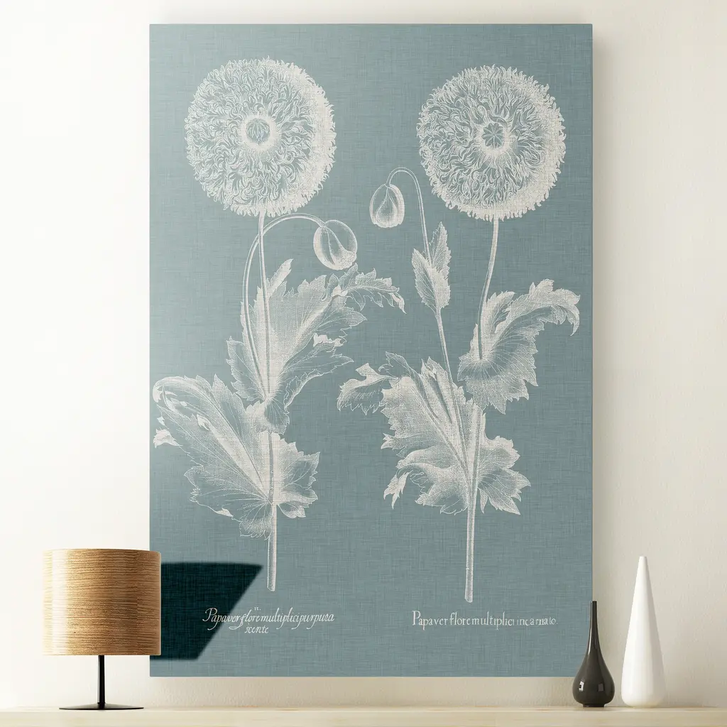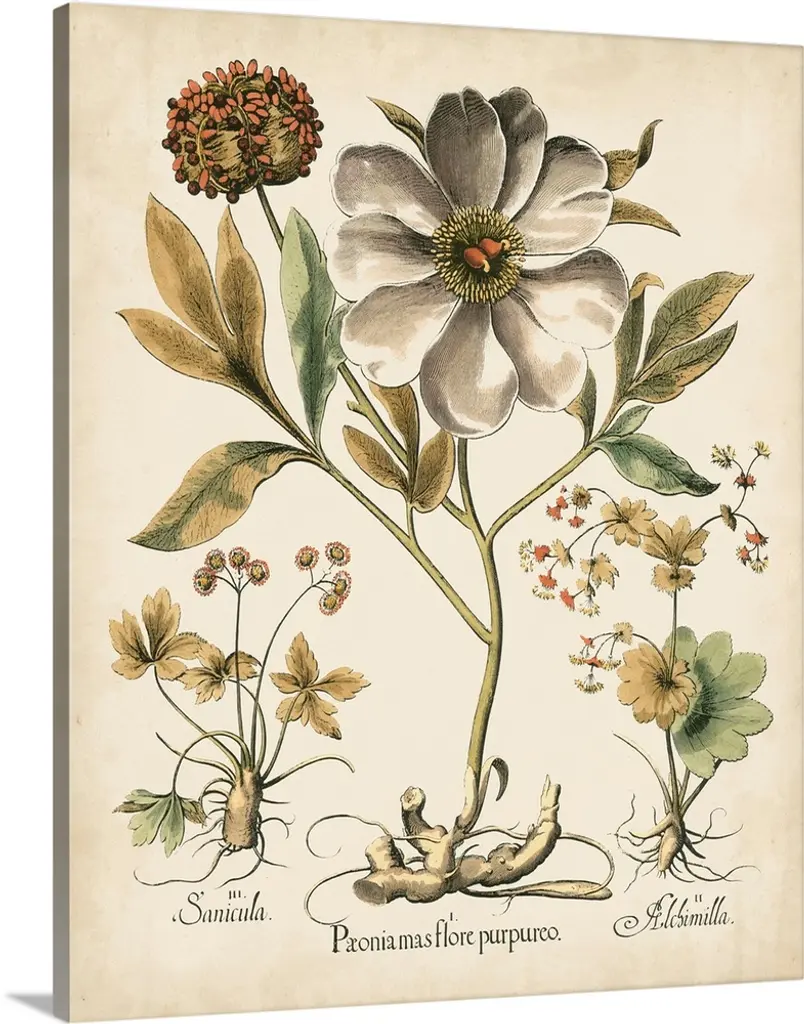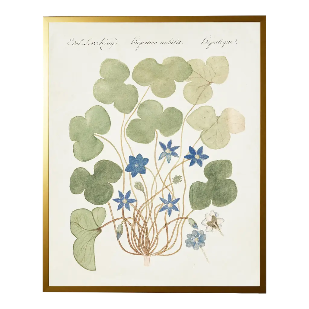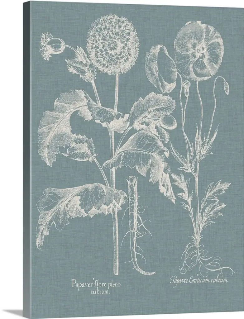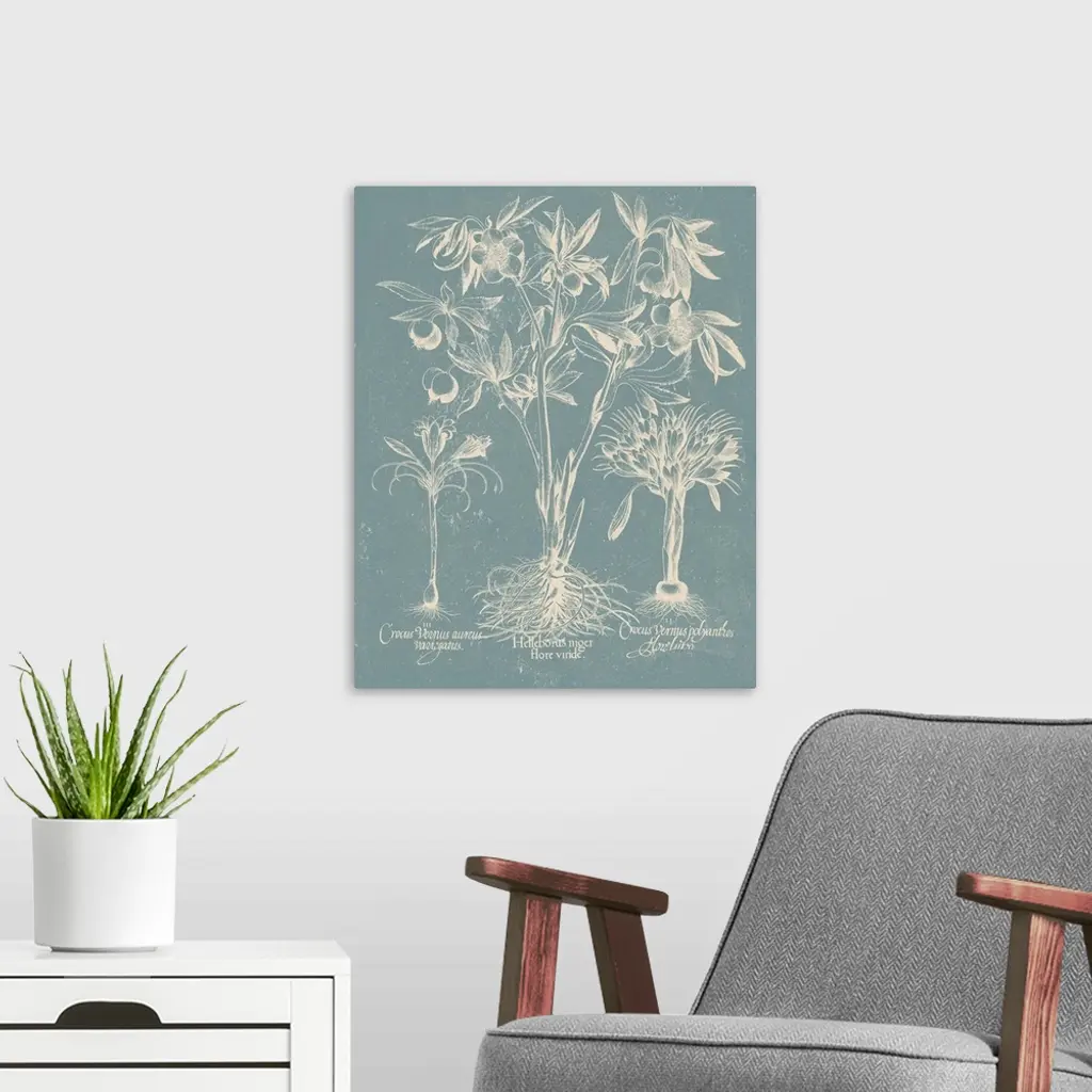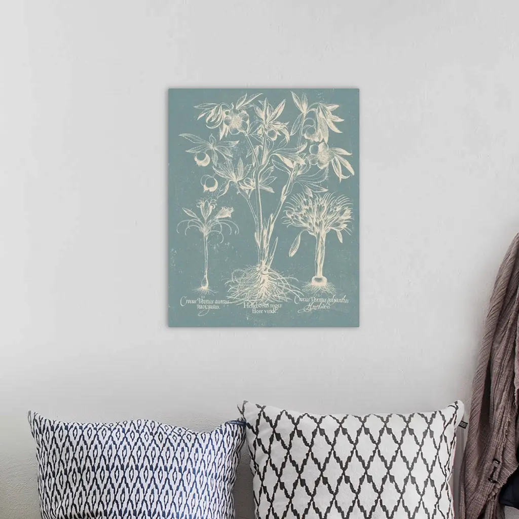 Vintage-inspired botanical illustration of besler leaves on a light blue background.