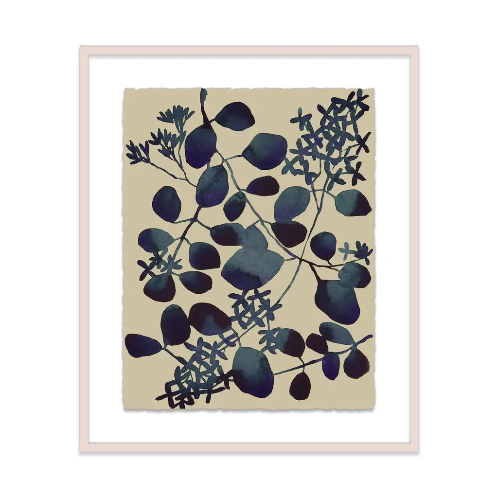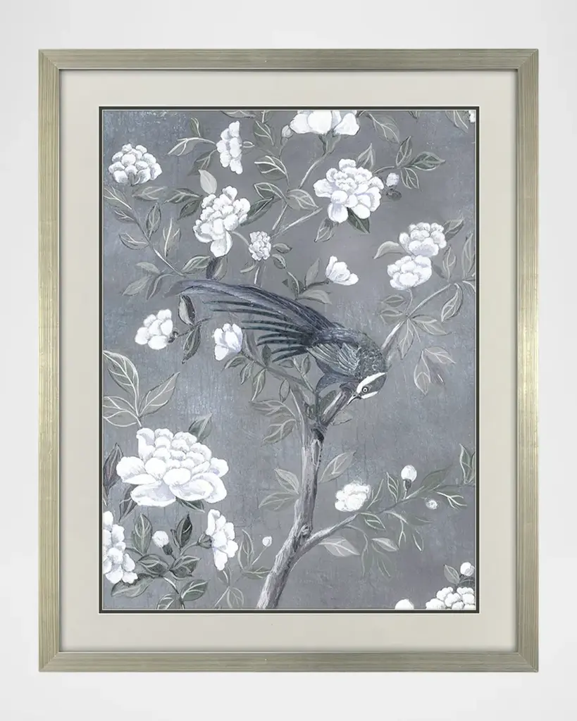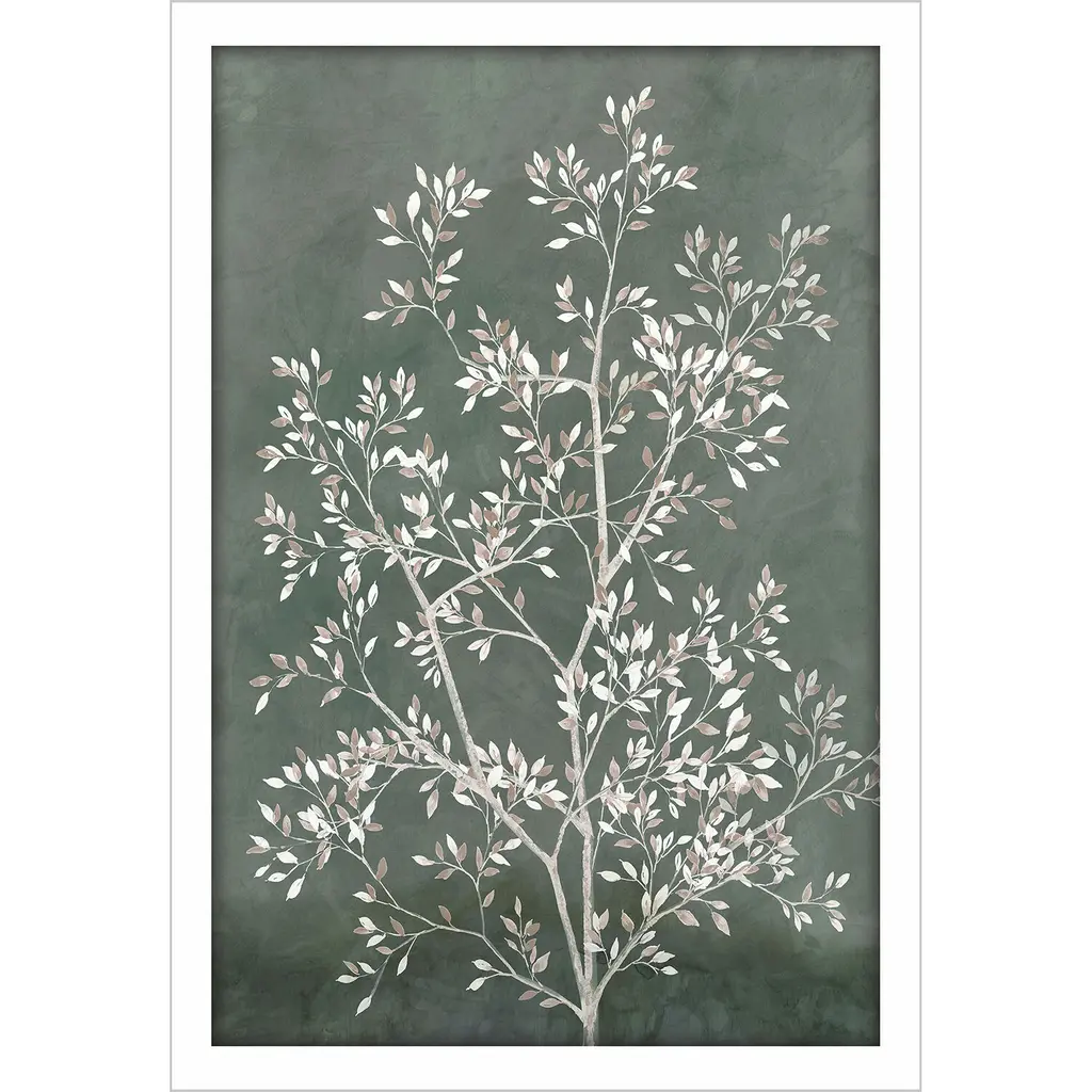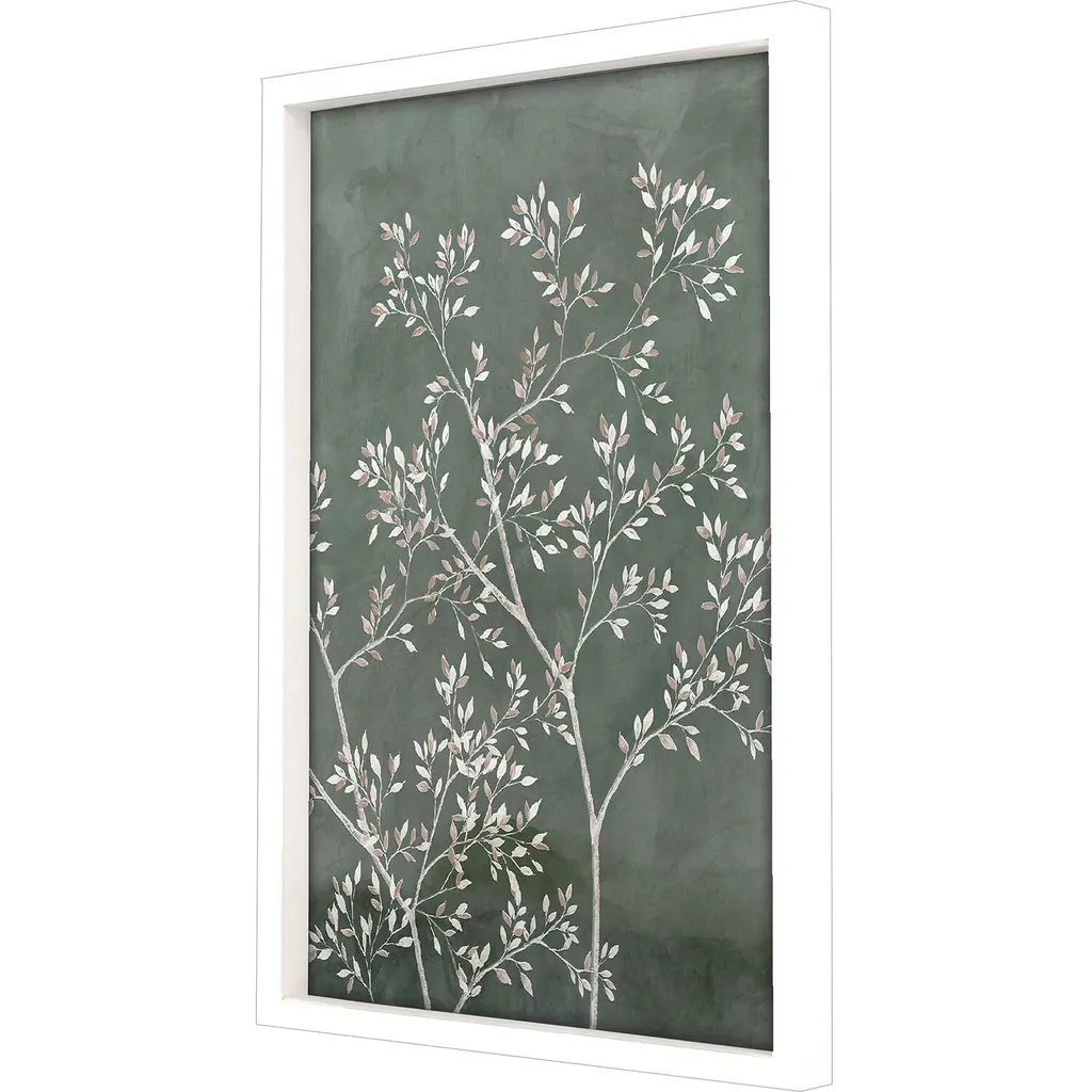 Delicate tree branches with white and beige leaves contrast with a mottled green backdrop. Framed in a lacquered white wood shadow box style moulding.