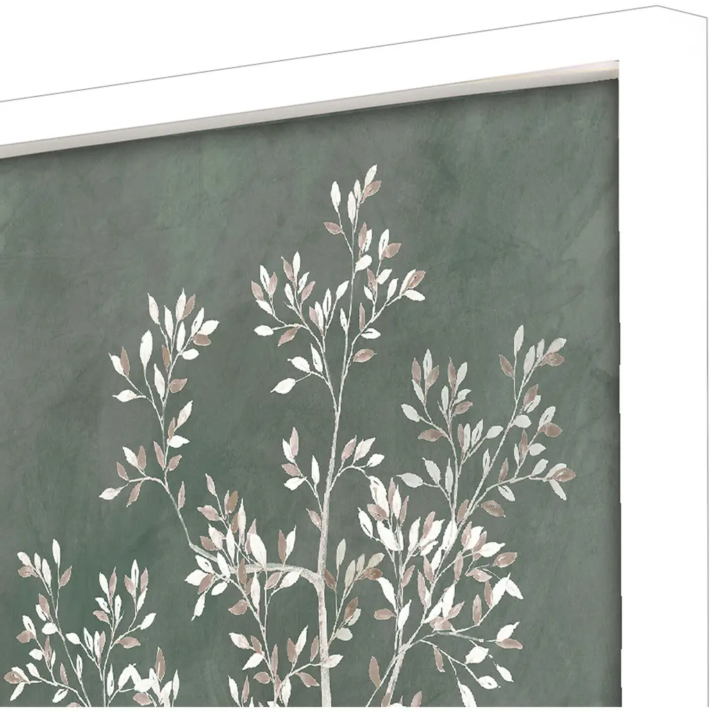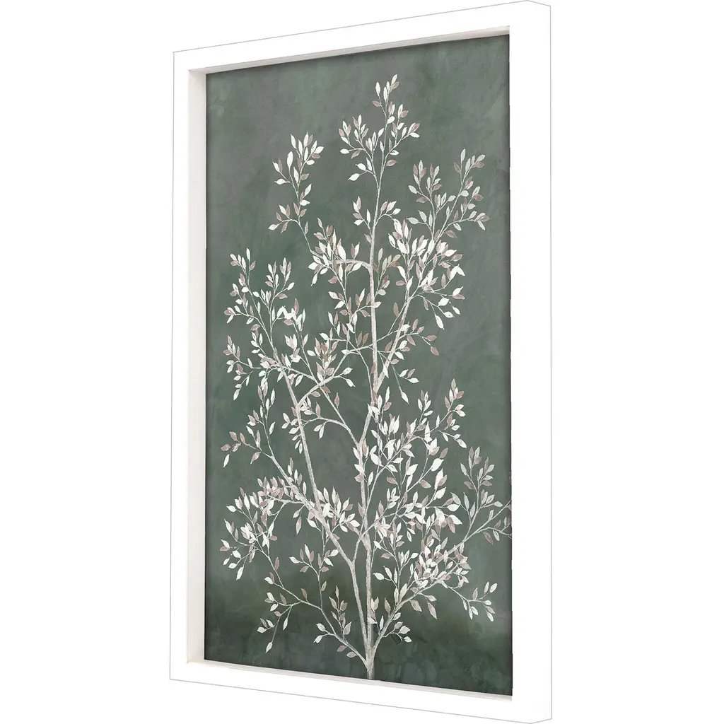 Delicate tree branches with white and beige leaves contrast with a mottled green backdrop. Framed in a lacquered white wood shadow box style moulding.